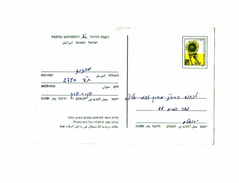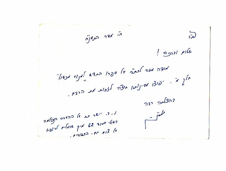 Postcard, hand-written by Rabbi Meir Mazuz, director of the Kiseh Rachamin Yeshiva, 18 Adar, 1998. Very good condition. Dimensions: 14.5x9.5 cm.