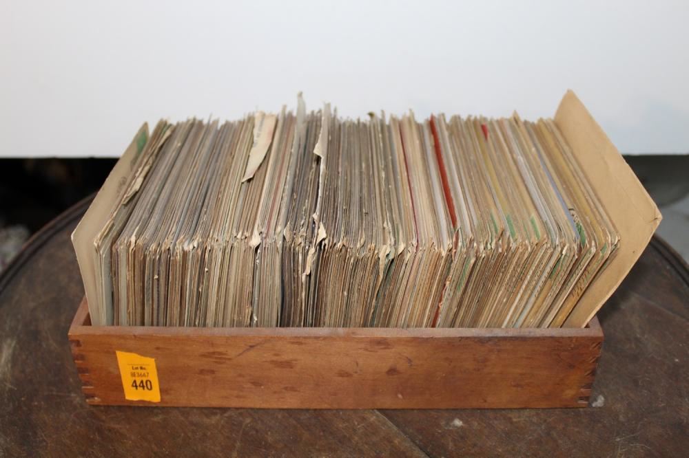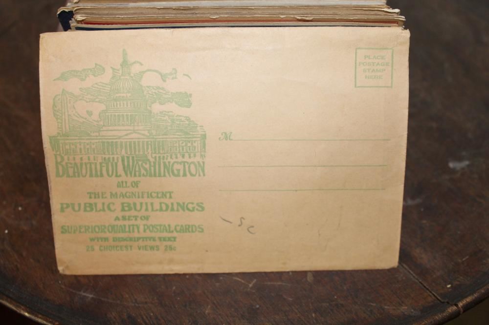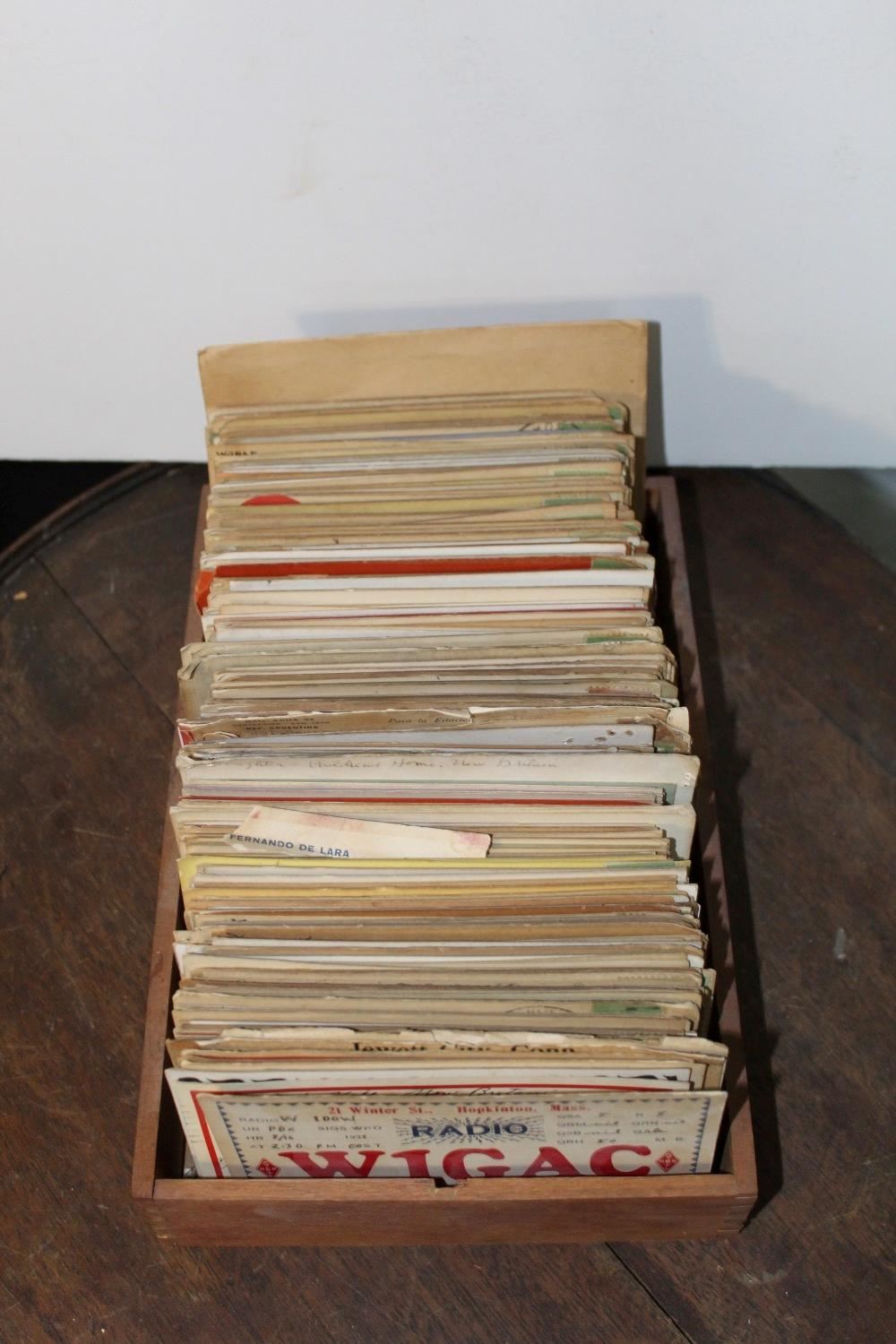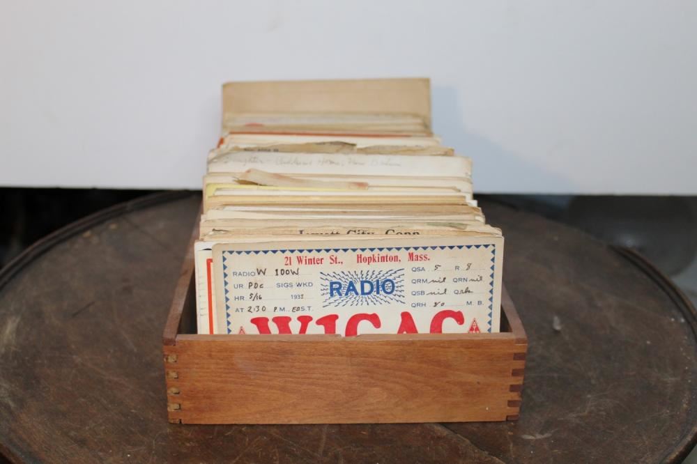 Postcard and ham radio cards in a wooden box. Approx. 7 inches wide x 10 inches deep.