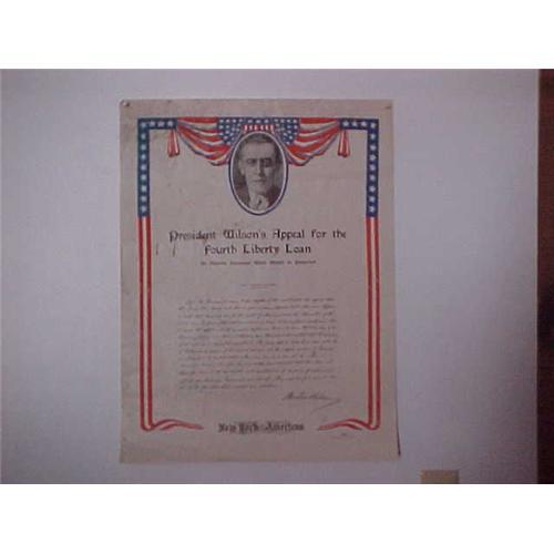 Poster,WW1, title--President Wilson's Appeal for the Fourth Liberty Loan . Under his picture added an Historic document which should be preserved;The White House Washington Document written in his long hand and signed Woodrow Wilson; Designed and copyrighted 1918 by Star Co.,under doc.Eagle an American Paper for American people--condition good-No tears; sharp colors, etc.