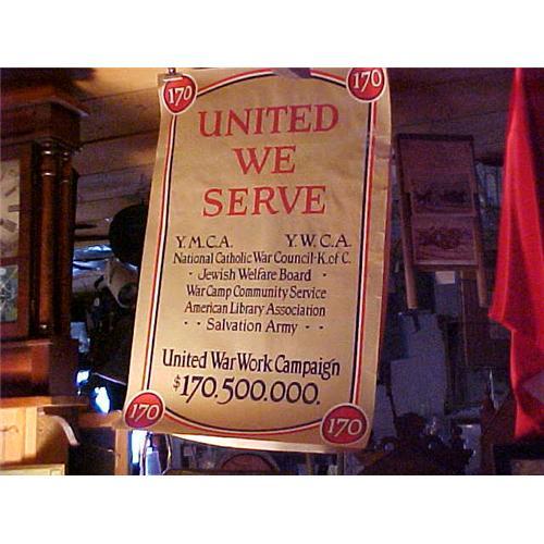 Poster WWI 20 X 29.75; United We Serve--YMCA==YWCA-National Catholic War K of C; Jewish Welfare Board; War Camp Community Service; American Library Association; Salvation Army; United War Work Campaign; $170,500,000
