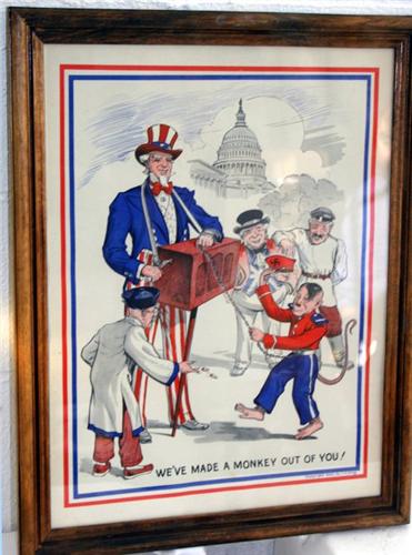 Political poster entitled We’ve Made a Monkey Out of You depicts Uncle Sam as an organ grinder and Adolf Hitler as a monkey. Copy right 1943 by J. H. King. Nicely framed under glass. Overall framed size approximately 17½” x 22 ½"