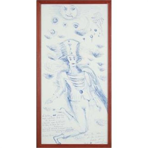 This poster print of ?The Actor? is a reproduction of a design he did. He created this design one night after his show in Lugano on the only white paper available, on the back of the poster, which is why both sides were reproduced. It is beautifully framed in a red wooden frame, and has glass both front and back which allows the viewer to see both sides. The entire piece, including the frame, is 28.25? x 14.25?. </font>