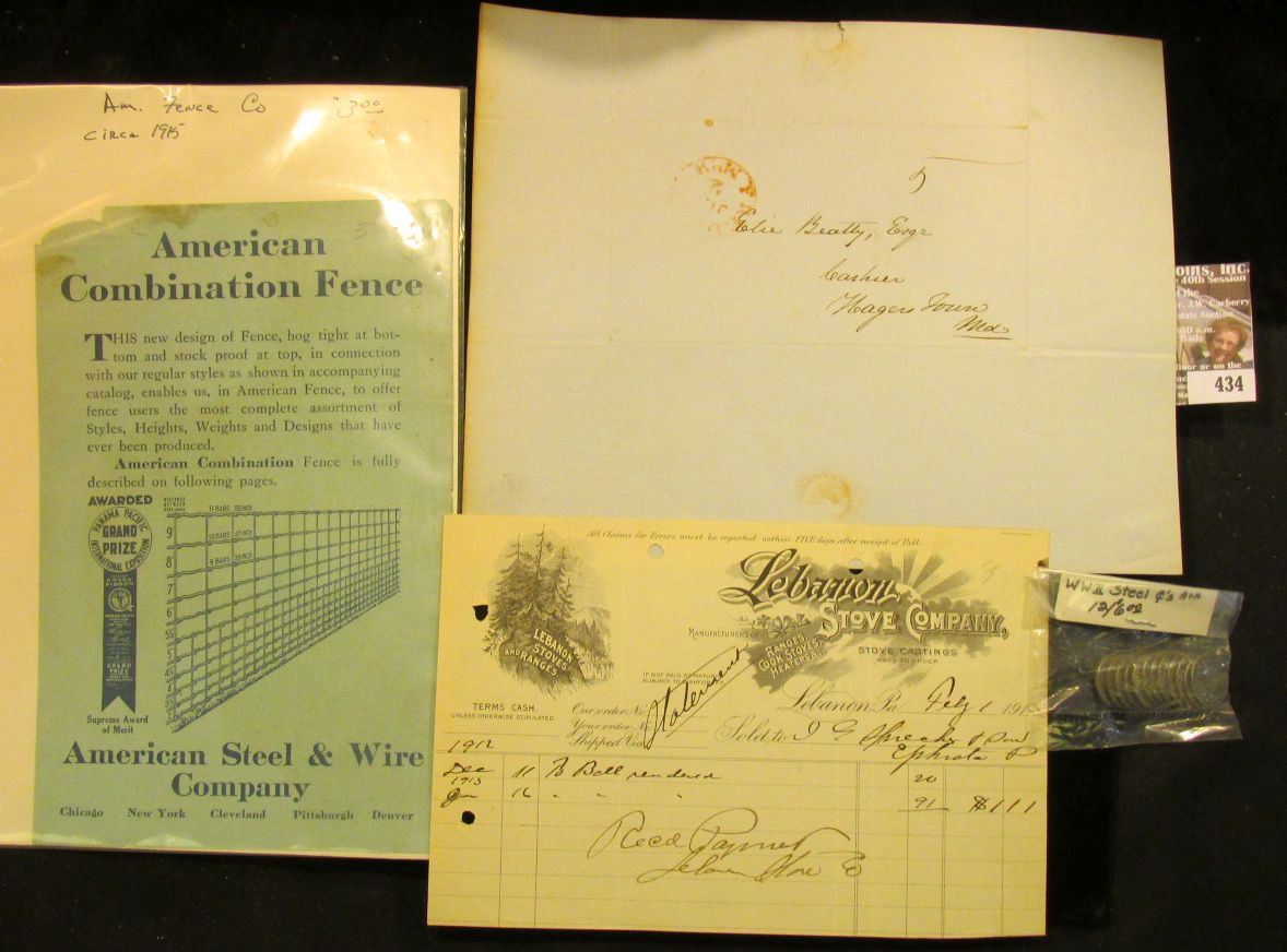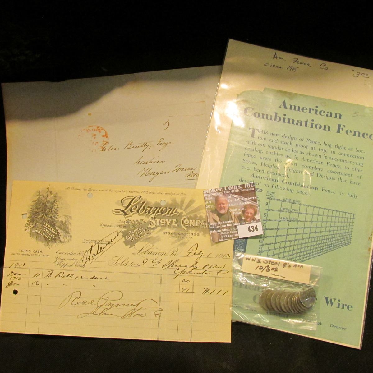 Postmarked Folded Letter from Frederick Town Branch Bank dated July 1, 1847; 1915 "American Combination Fence" Advertising sheet; Feb. 1, 1913 "Lebanon Stove Company" Invoice; & (12) World War II Steel Cents.