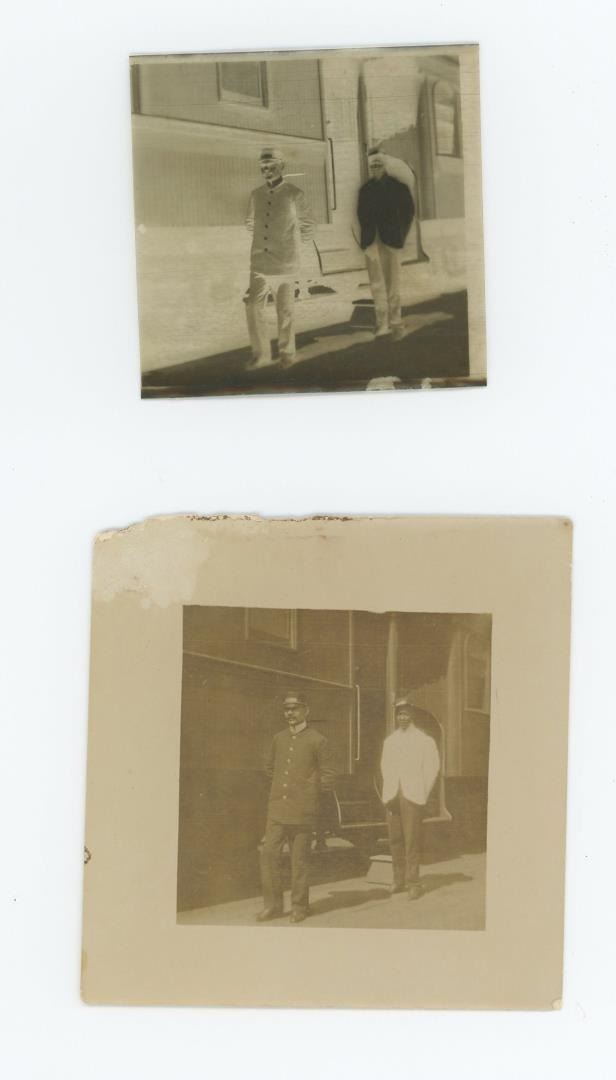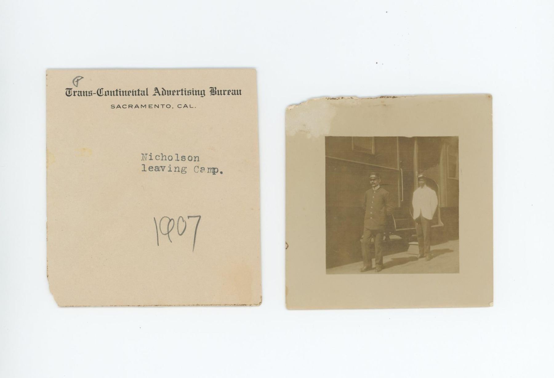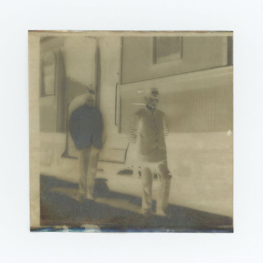 Photo negative of WM Nicholson, postmaster of Rawhide Nevada. 3 1/4" square. In December 1906, prospector Jim Swanson made a discovery of a rich gold and silver deposit in the hills near what became Rawhide. He was soon joined by Charles ("Charley") B. Holman and Charles ("Scotty") A. McLeod, who also found sizeable deposits nearby on Hooligan Hill. McLeod had recently been ordered to cease prospecting around the nearby camp of Buckskin, and bitter about this, he suggested the name of Rawhide for the new camp, as a play on the name of the Buckskin camp he held with contempt. Word spread, and both Holman and McLeod sold their claims to investors and moved on to Stingaree Gulch later in 1907, where they found yet another large deposit. The two men sold these claims for even more money, and then left the area to prospect elsewhere. The frenzy that these claims created soon had Rawhide booming. Investors began selling stocks at a frenetic pace, and the town soon had a population of about 5,000, with: three banks, four churches, a school, twelve hotels, twenty-eight restaurants, a theater, and thirty-seven saloons. While the original mines and claims did produce a decent profit in gold and silver, the fever created an amount of activity far in excess of what the mines could support. Stock swindlers like George Graham Rice, a flashy con-artist from Goldfield, plied their trade, creating a sense that Rawhide would be the next Virginia City (or the like of any number of other Nevada boom towns), with untold riches to be had for the savvy folks who would just invest in his companies. Others, like businessman George "Tex" Rickard came to Rawhide to establish legitimate businesses, and make money off the boom while it lasted. Rawhide's hey-day was short-lived; the glaring, gross over-promotion which manipulators performed to inflate the worth of Rawhide doomed its chance for success from the start. In the short span of two years the town went from its peak population of 7,000 people (March to June, 1908), to fewer than 500 people by the latter part of 1910. Helping push the decline of the town even further along was a disastrous fire which swept through Rawhide in September 1908, along with a flood in September 1909, from which many people did not recover or rebuild. While the original mines worked out the last of the gold and silver from the veins first discovered by Swanson, Holman, and McLeod, people began to leave the area, moving to the next "big thing". While there remained a few people eking out a life working in the mines, or processing the ore, or just working their own claims and prospecting, for all intents and purposes the town became a hollow shell of what it once was. The population was 32 in 1940.