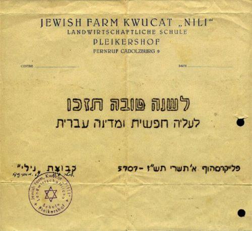 Postwar. Broadside, 1946, 8 -1/2 x 9, announcing a "Jewish Farm" School, D.P. Camp Pleikershof, Germany, "for a good year to be credited to free Aliyah and a Hebrew State." Printed in German, Hebrew, and English. Circular rubber stamp at left corner containing a Jewish star. Fine. With affidavit, 1946, signed by Chief of Police of Gelsenkirchen, affirming that Salomon Goldman, born in Poland, resident in Brussels, is a stateless person. His wife and two children were deported in 1942 from Gelsenkirchen. Two circular handstamps, 6 x 9. Wear at original folds.