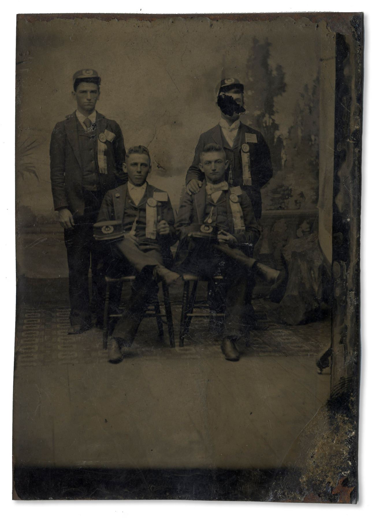 Civil War tintype of four Union soldiers, two seated crosslegged, two standing. The men are not in uniform, indicating this is likely a postwar image. One of the seated men holds up a flag emblem with 13 stripes but only seven stars in the field, suggesting the men may be citizens of Maryland, the seventh state to join the Union. The ribbons on their lapels indicate that they are likely at a G.A.R. reunion. Image measures 2.75'' x 3.75''. Surface damage obscures the face of one standing soldier. Overall, good condition.