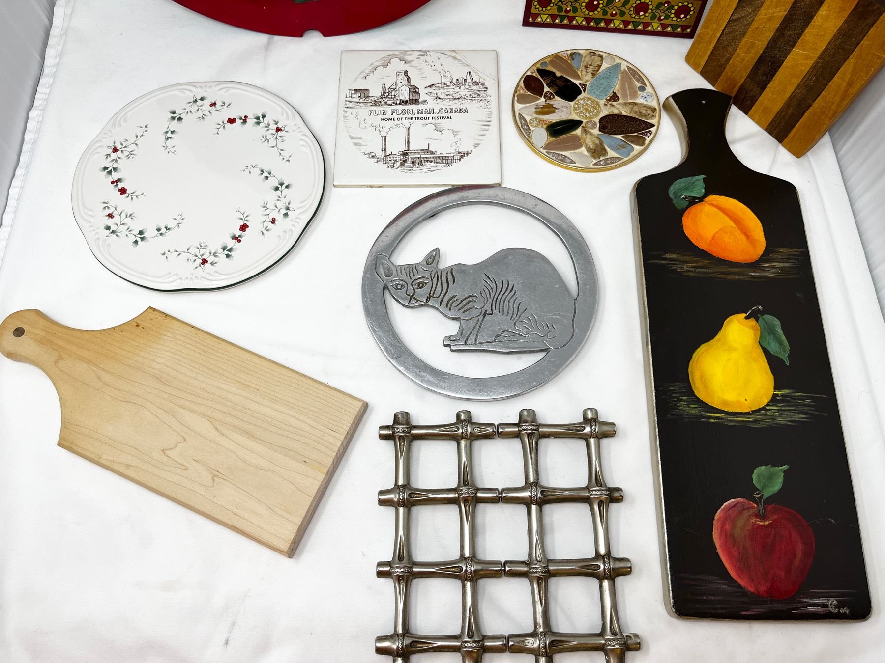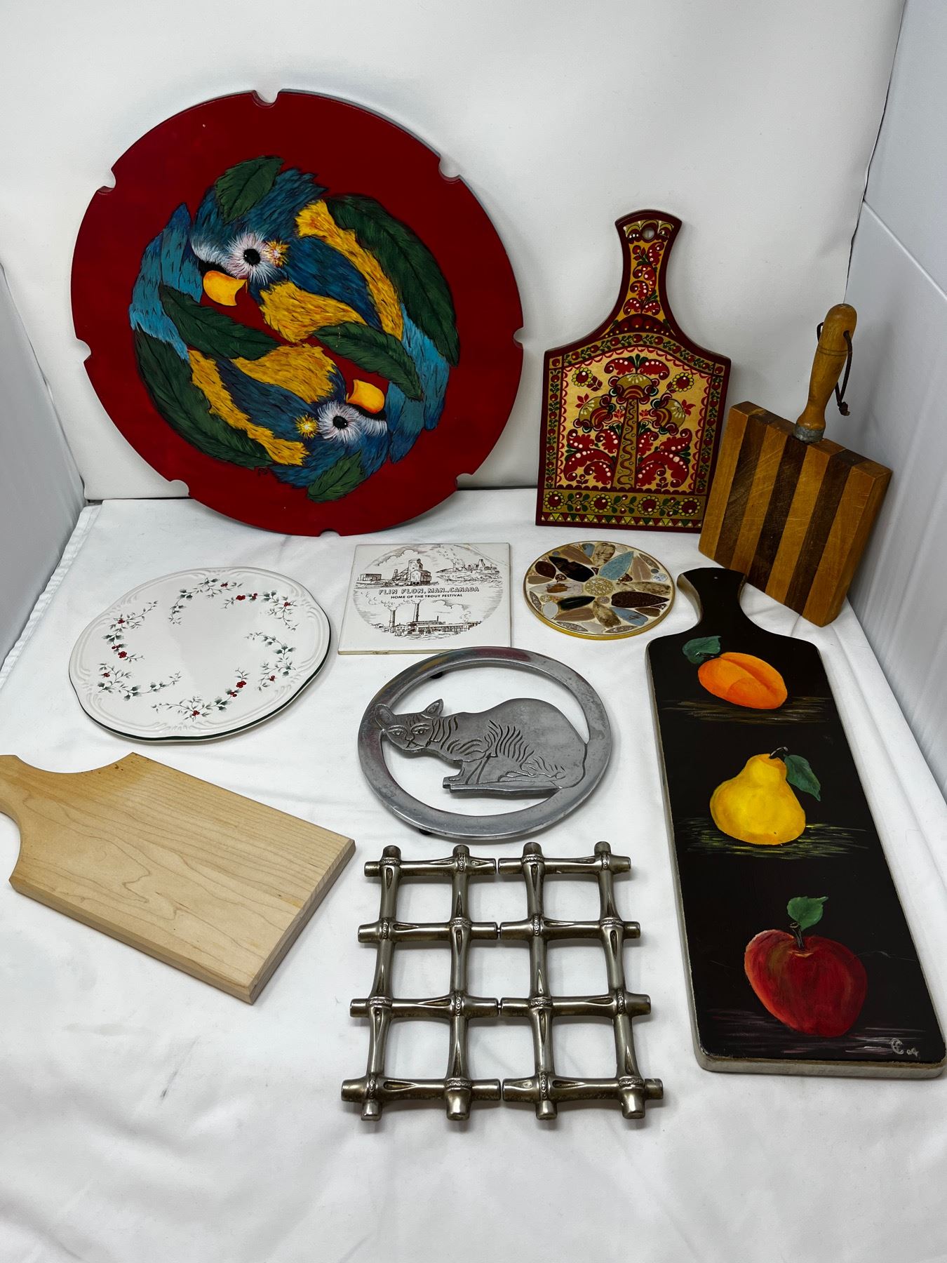 Group lot of mixed pot holders, a lazy suzan and other countertop cutting boards.