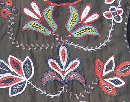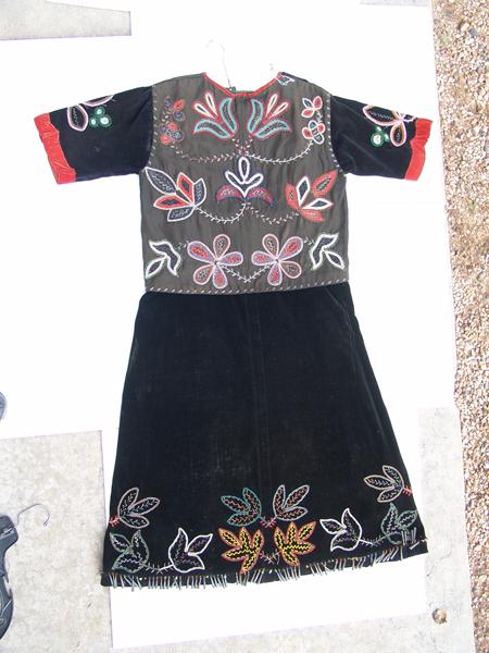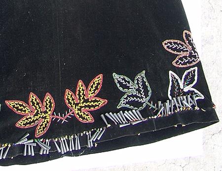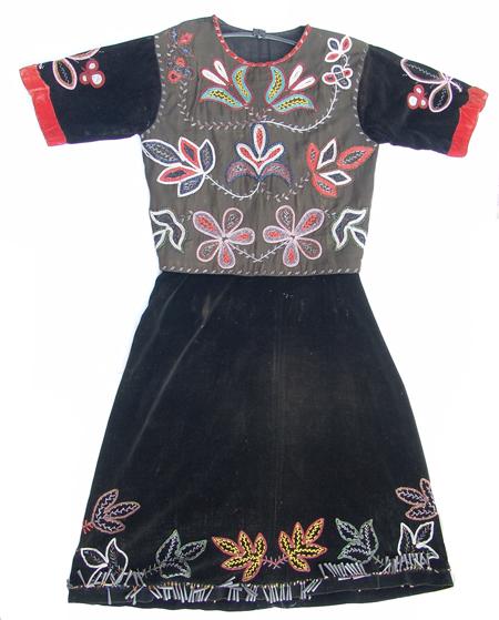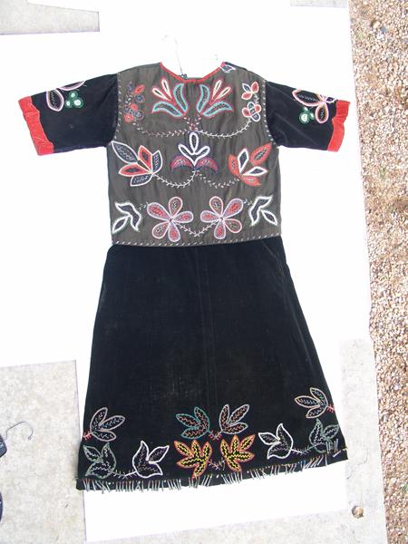 Beautiful black cotton and velvet set profusely decorated with multi-colored floral beadwork and tin cones around bottom of skirt. Sleeves and neck trimmed with red velvet. Purchased from AIA Auction in 1979 for $236; appraisal value $750. Blouse 38" long