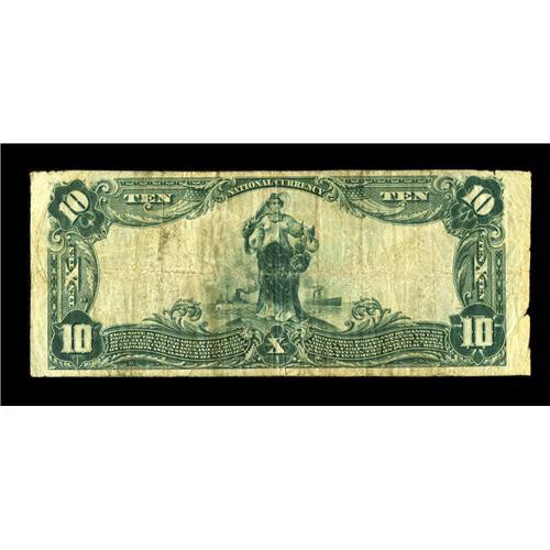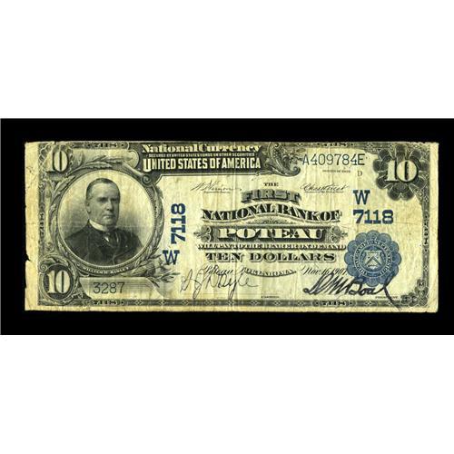 <B>Poteau, OK</B></I> - $10 1902 Plain Back Fr. 626 <B>The First NB</B></I> Ch. # (W)7118<BR>The census from this very rare community stands at just six pieces, one from the town's other bank (which has never been offered for sale) and five from this bank, two Territorials and three state notes. Only two of that number have ever been offered at public sale, one of which was part of this collection in our last auction, realizing just over $4000. This example is not quite as high grade, but still should fetch a substantial sum before the hammer falls tonight. <B>Fine,</B></I> with the top margin trimmed just a bit close.<BR><BR><b>Shipping:</b> Coin/Currency (<a target="_blank" href="http://www.heritageauctions.com/common/shipping.php">view shipping information</a>)