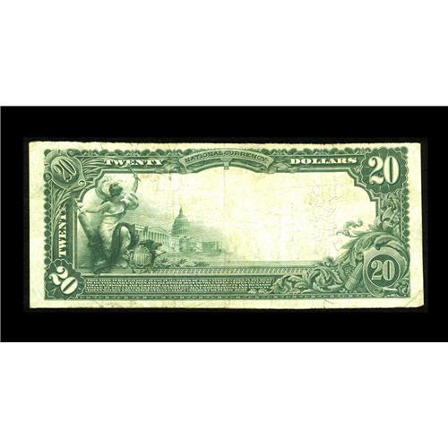 <B>Poteau, OK</B></I> - $20 1902 Plain Back Fr. 652 <B>The First NB</B></I> Ch. # (W)7118<BR>The census from this very rare community stands at just six pieces, one from the town's other bank (which has never been offered for sale) and five from this bank, two Territorials and three state notes. Only one of that number has ever made it to the marketplace, with that offering coming almost ten years ago. The note we offer here is the nicest example from this issuer by a full two grades, and is certain to delight its fortunate new owner. Sharp <B>Very Fine,</B></I> with distinctive two color signatures and exceptionally vivid printing.