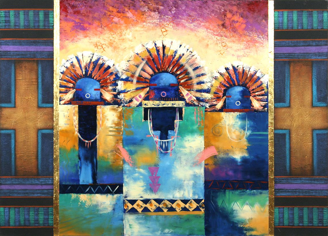 Poteet Victory (b. 1947). Evening Prayers. 32" x 44" mixed media on canvas. Signed in top of image: POTEET VICTORY. (est. $4,000-6,000). CONDITION REPORTS: www.auctioninsantafe.com/docs/cr2012.pdf