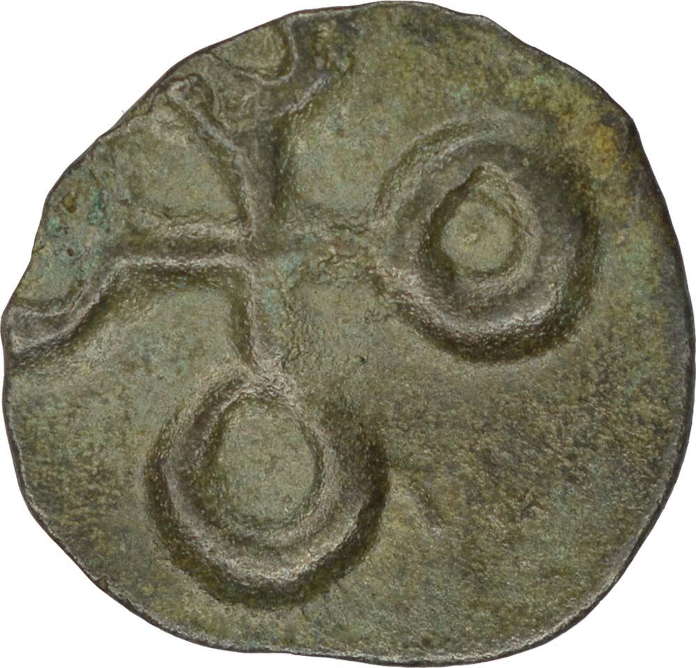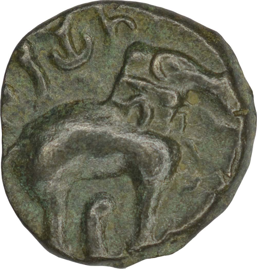 Potin Unit, Obv: elephant facing right and brahmi legend ‘sri.riyajnasa.takanisa’,Rev:ujjaini symbol, 2.20g, 17.44mm,aboutextremely fine.
