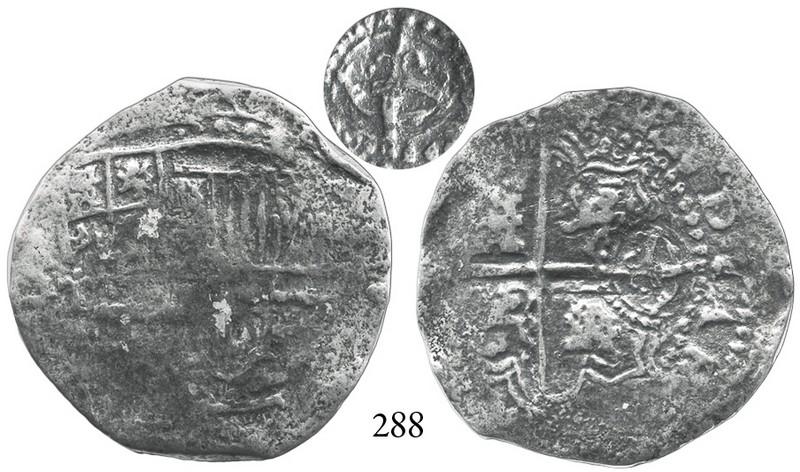 Potosí, Bolivia, cob 8 reales, Philip IV, assayer T (1640s), with crowned L countermark on cross side, rare. S-P30, KM-19a. 19.6 grams. Common countermark but rare on a pre-1648 coin, as this must be (assayer T), even though the date is not visible. Full but off-center cross, full but weak shield, a bit worn and pitted, but countermark and assayer both very clear. Pedigreed to the Louis Hudson collection. Recovered from: Capitana (Jesús María de la Limpia Concepción), sunk in 1654 off Chanduy, Ecuador