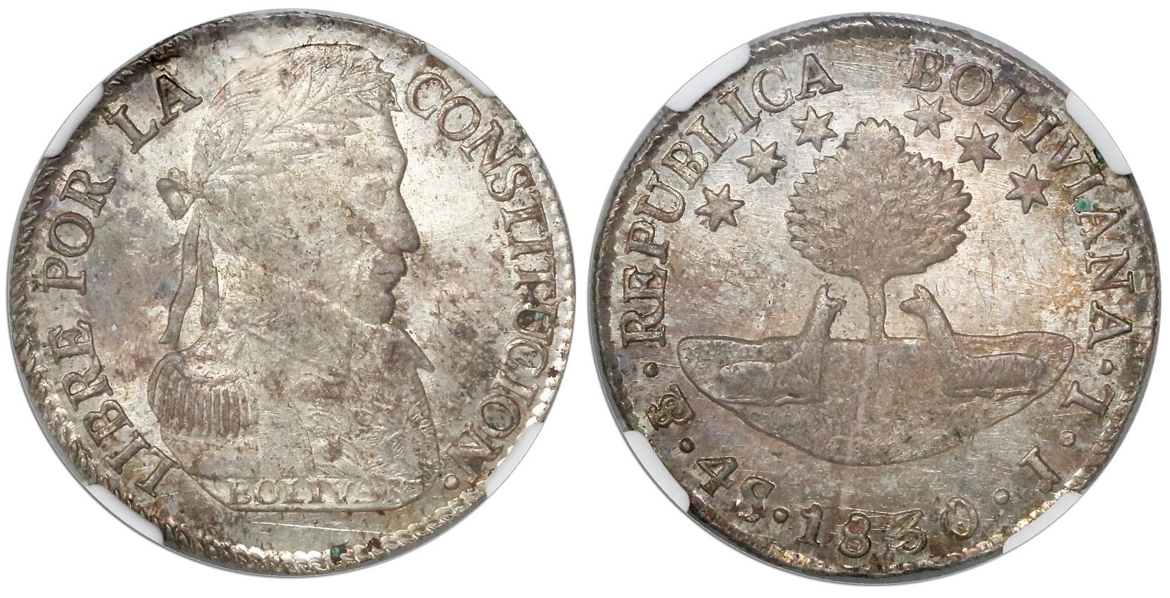 Potosi, Bolivia, 4 soles, 1830JL, encapsulated NGC MS 62. KM-96a.1. Lustrous fields and nearly frosty details, no marks or wear but the high points typically slightly weak, patchy rainbow toning.