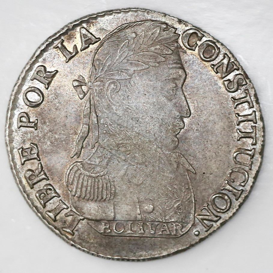 Potosi, Bolivia, 4 soles, 1830JL, monogram on island. KM-96a.1. 13.50 grams. AU+ with muted luster and light old cleaning now toned over with bright, multicolor toning.
