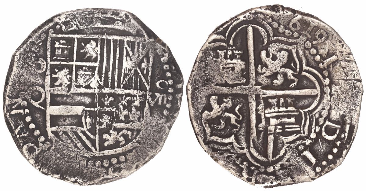 Potosi, Bolivia, 8 reales, Philip III assayer Q, with  1619  date tooled into legend on reverse.