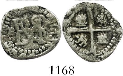 Potosi, Bolivia, cob 1/2 real, Philip II, assayer B to left (4th period), mintmark P to right. S-P12; KM-6.1 (under Philip III); CT-726. 1.6 grams. Good full monogram and cross, bold assayer, Fine details but lightly porous as from unspecified salvage.