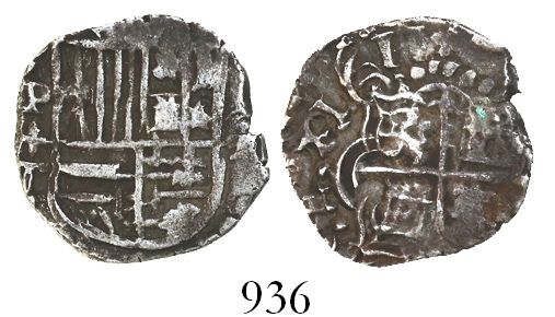 Potosi, Bolivia, cob 1 real, 1618T, upper half of shield and quadrants of cross transposed, rare. S-P21; KM-7. 3.62 grams. Full date outside off-center full cross, choice full shield with full P+T to left, nicely toned XF.
