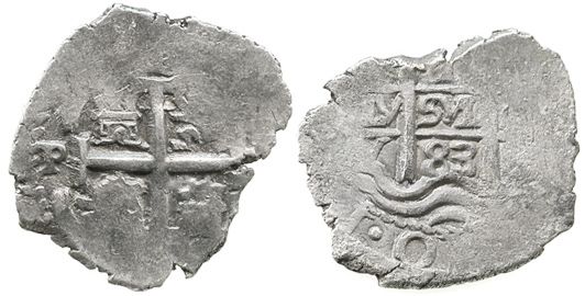 Potosi, Bolivia, cob 1 real, 1683V. S-P39; KM-23; CT-721. 3.5 grams. Bold date above full waves, very bold cross with mintmark to left, high grade (XF) but with flat peripheries and crude edge (as made).