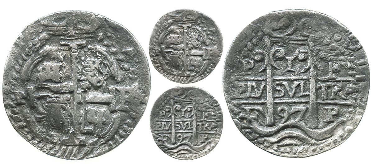 Potosi, Bolivia, cob 1 real Royal, 1697F, extremely rare (possibly unique). S-P42; KM-unl; CT-unl. 3.1 grams. Like all Royals, this coin is round and even in thickness (thin and broad too), with full inner details, the pillars side in this case very nice but the cross side double-struck, deeply toned all over, VF, with expertly plugged hole in waves near edge. In researching this coin, we found that it is unique in several ways (at least known to us), namely as the only 1697F Royal of any denomination and the only 1R Royal for this assayer and period; and while we suspect there are other 1R Royals of this period off the record, this is probably still the only 1697F in existence.