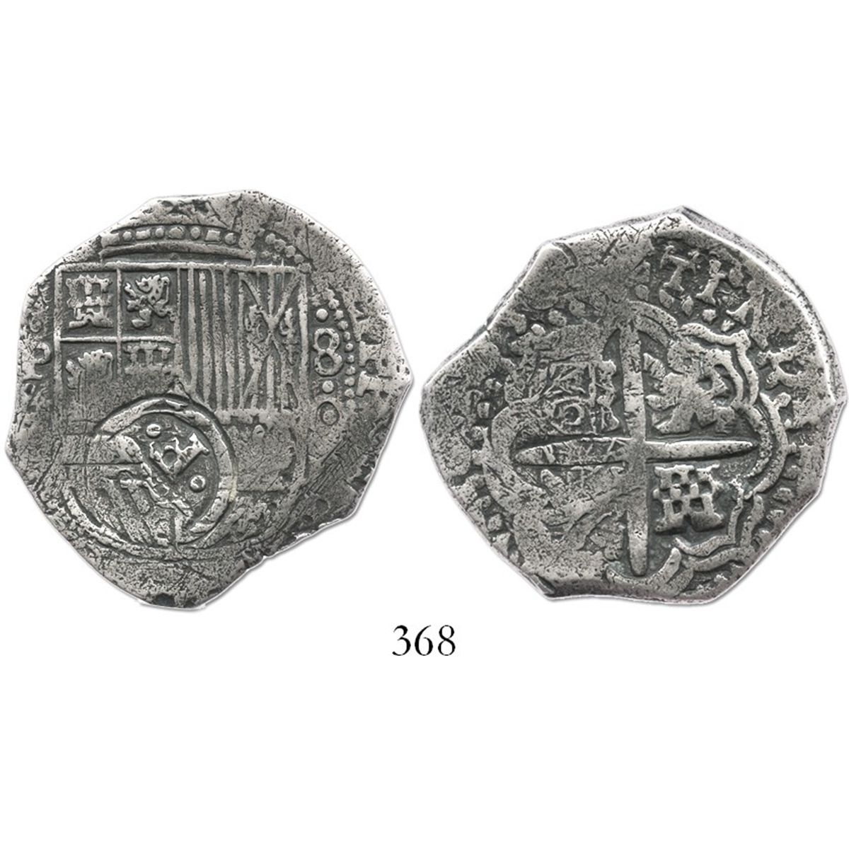 Potosi, Bolivia, cob 4 reales, (1)650O, with crowned-.F. countermark on shield, unique error struck with 8R shield die. S-P35; KM-17b; CT-unl. 13.4 grams. Fascinating coin with full and well-detailed shield but with bold denomination 8 to right above assayer O, bold countermark, good full cross (4R-sized) with some flatness, no corrosion, nicely toned. Recovered from: Capitana, sunk in 1654 off Chanduy, Ecuador