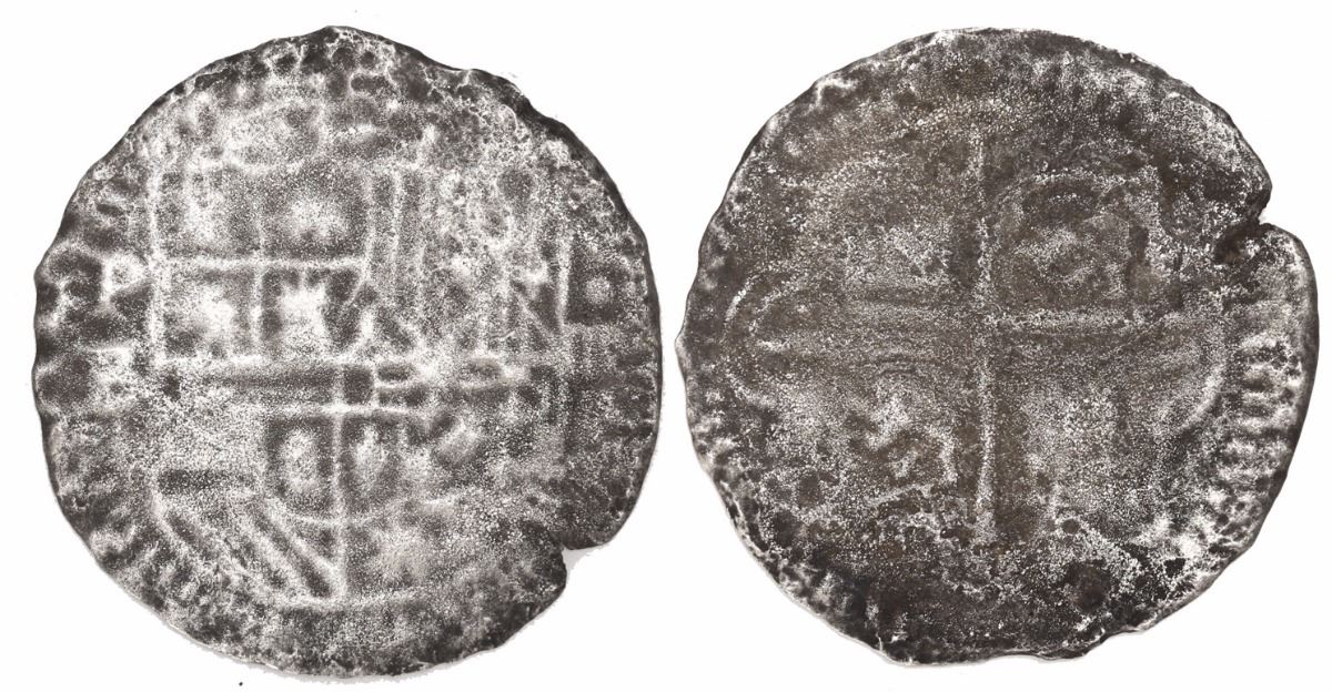 Potosi, Bolivia, cob 4 reales, Philip II, assayer B (3rd period). 7.60 grams. Round flan with good full shield and bold P-B despite moderate corrosion and thinning. Pedigreed to the David Horner collection. Recovered from: San Martin, sunk in 1618 off the east coast of Florida