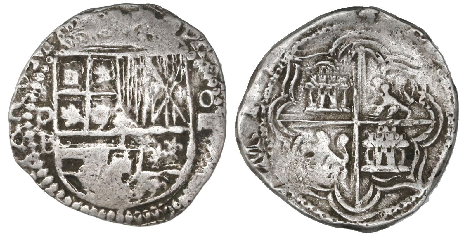 Potosi, Bolivia, cob 4 reales, Philip II, assayer B (5th period), border of x's on cross side only. S-P14; KM-4.3. 13.68 grams. Bold full cross and shield with clear border of x's around the former only, VF with contrasting sediment in crevices.