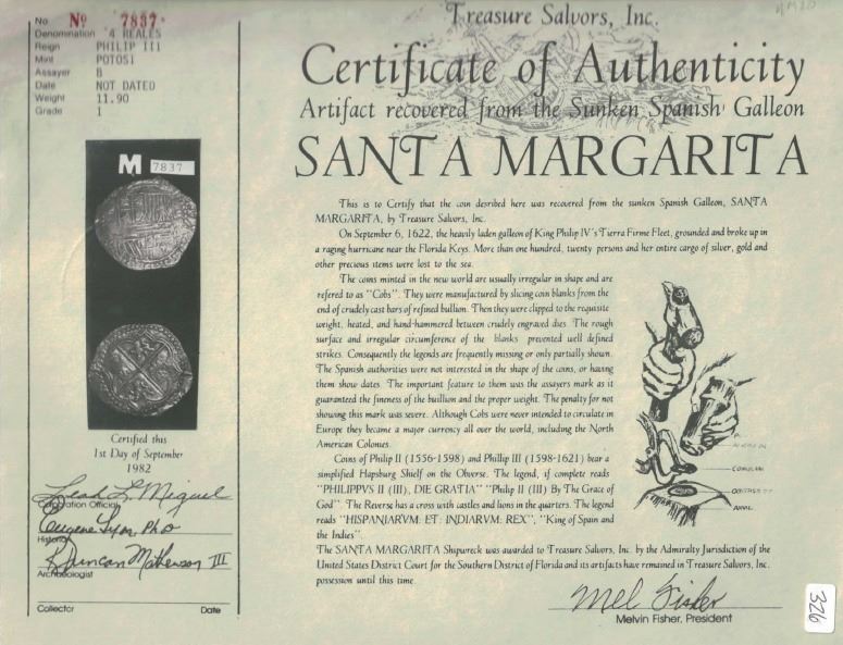 Potosi, Bolivia, cob 4 reales, Philip II, assayer B, Grade 1. KM-4.2. 11.92 grams. Superb full cross-lions-castles with 100% complete tressure, also choice full shield, nicely toned, minimal surface corrosion. With Fisher tag and photo-certificate #7837. Recovered from: Santa Margarita, sunk in 1622 west of Key West, Florida