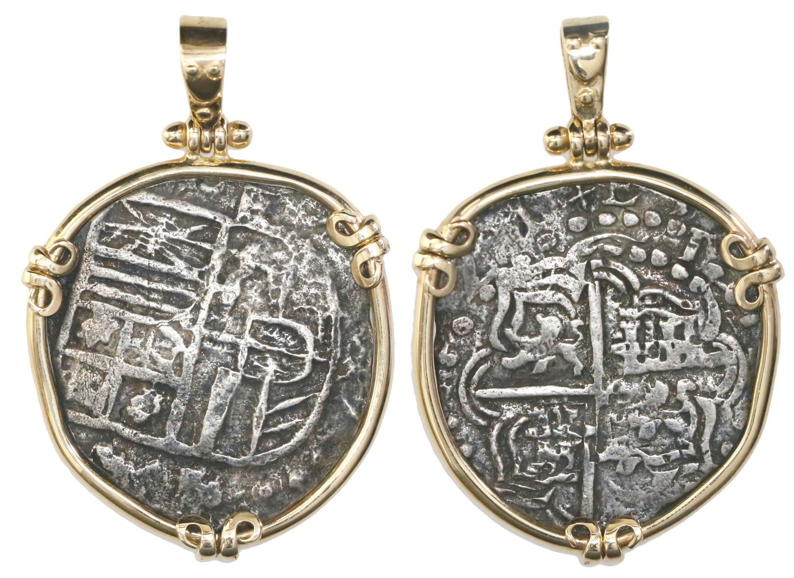 Potosi, Bolivia, cob 4 reales, Philip III, assayer T, quadrants of cross transposed, Grade 2, from the Atocha (1622), tag and certificate missing, mounted cross-side out in 14K gold bezel with shackle bail. 17.73 grams total. Slightly corroded but full cross and shield, darker toned surfaces. From the Atocha (1622), Fisher database #85A-200408.