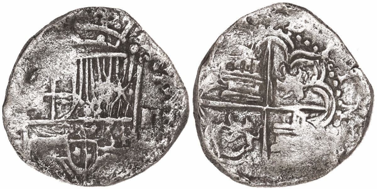 Potosi, Bolivia, cob 4 reales, Philip III, assayer not visible, Grade 1, with original tag but certificate missing. 12.85 grams. Good full cross, full but slightly off-center shield with most of crown above, minimal corrosion. Pedigreed to the Thomas Gray collection and formerly displayed at the ANA Money Museum's "Treasures of the Deep" exhibit (2014-15), with Fisher tag #157614. Recovered from: Atocha, sunk in 1622 west of Key West, Florida
