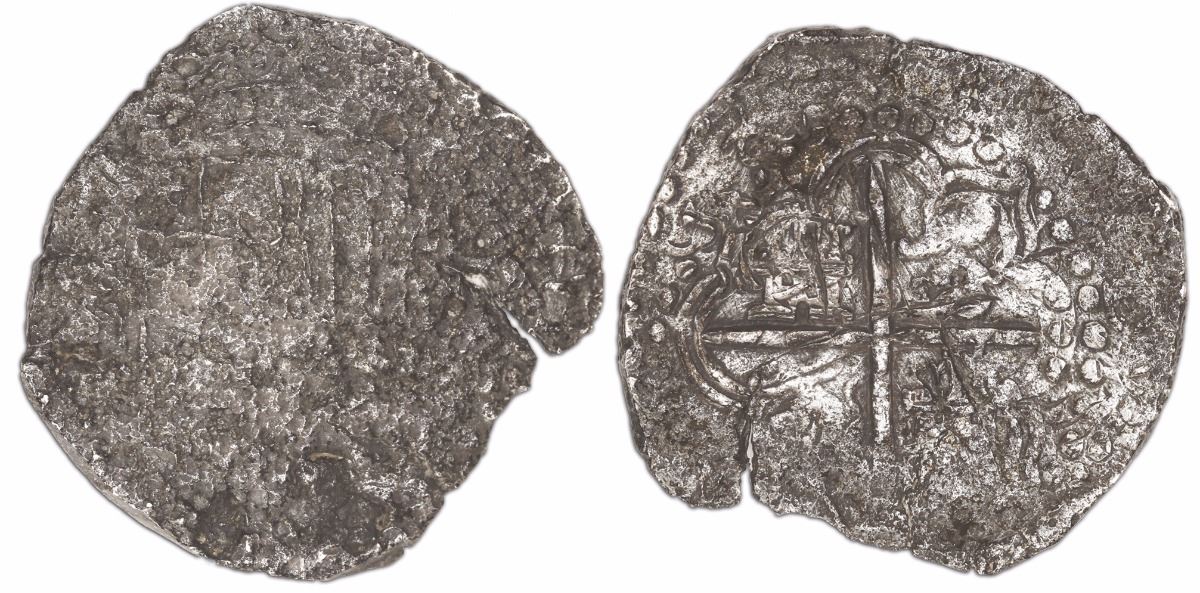 Potosi, Bolivia, cob 8 reales, 1618(T), Grade 3. 24.05 grams. Oddly darkly toned, with clear 18 of date outside doubled cross, corroded shield, edge-split. With Fisher certificate #190435. Recovered from: Atocha, sunk in 1622 west of Key West, Florida