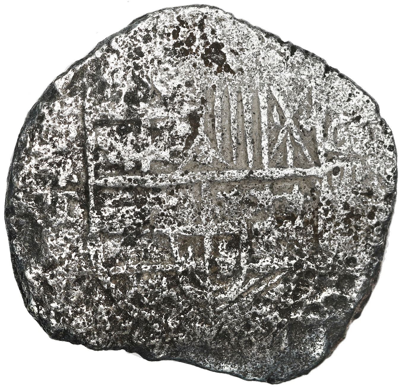 Potosi, Bolivia, cob 8 reales, 1618 T, quadrants of cross transposed, Grade 2. S-P21; KM-10; Cal-926. 24.00 grams. Full but corroded shield, the cross weaker and slightly doubled but with clear parts of date visible, patchy toning. With Fisher tag and certificate 85A-140331, pedigreed to the RWB Reference Collection of Atocha dated cobs. Recovered from: Atocha, sunk in 1622 west of Key West, Florida
