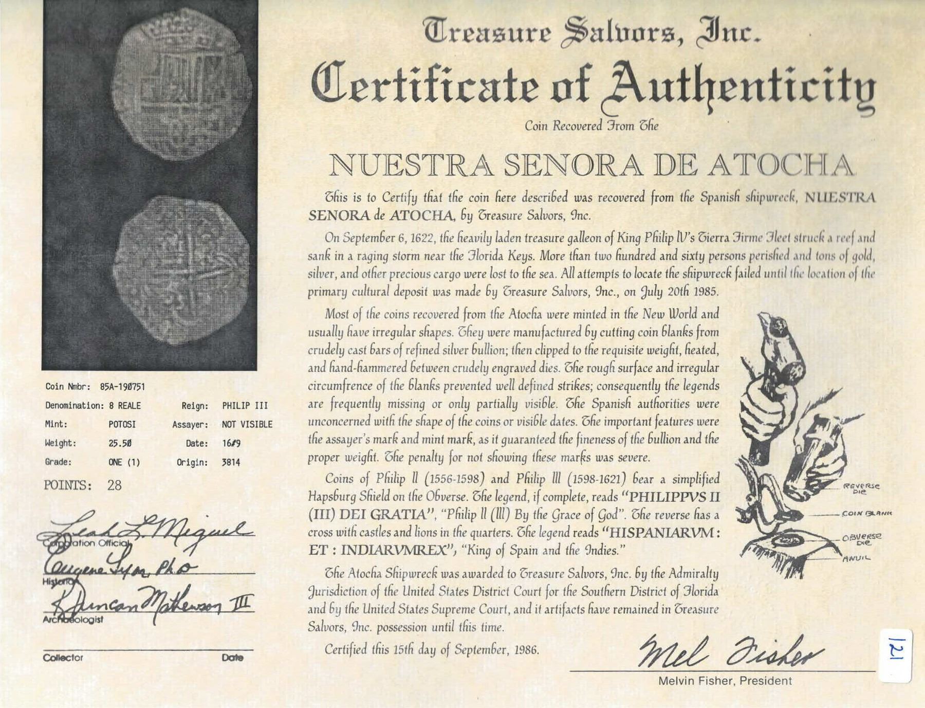 Potosi, Bolivia, cob 8 reales, 1619 (T), Grade 1. S-P21; KM-10; Cal-927. 24.56 grams. Full and clear 9 of date outside of full but slightly doubled cross, choice complete crown above shield with full denomination o-VIII to right, only traces of minor surface corrosion. With Fisher tag and certificate 85A-190751, pedigreed to the RWB Reference Collection of Atocha dated cobs. Recovered from: Atocha, sunk in 1622 west of Key West, Florida