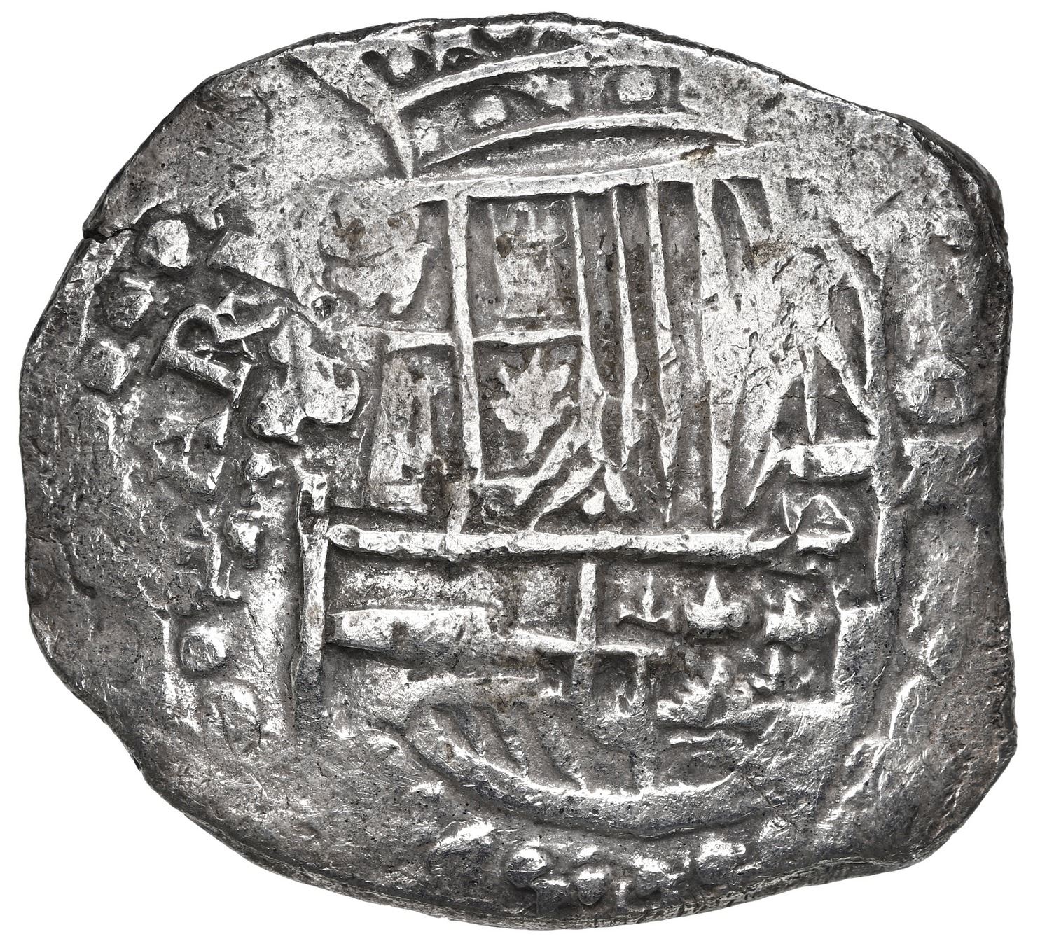 Potosi, Bolivia, cob 8 reales, 1619 T, Grade 2. S-P21; KM-10; Cal-927. 26.00 grams. Broad oblong flan with choice full shield and cross (slightly doubled) without any corrosion, lightly toned in crevices, clear right side of 9 of date visible. With Fisher photo-certificate 85A-124458 (tag missing). From: Atocha, sunk in 1622 west of Key West, Florida