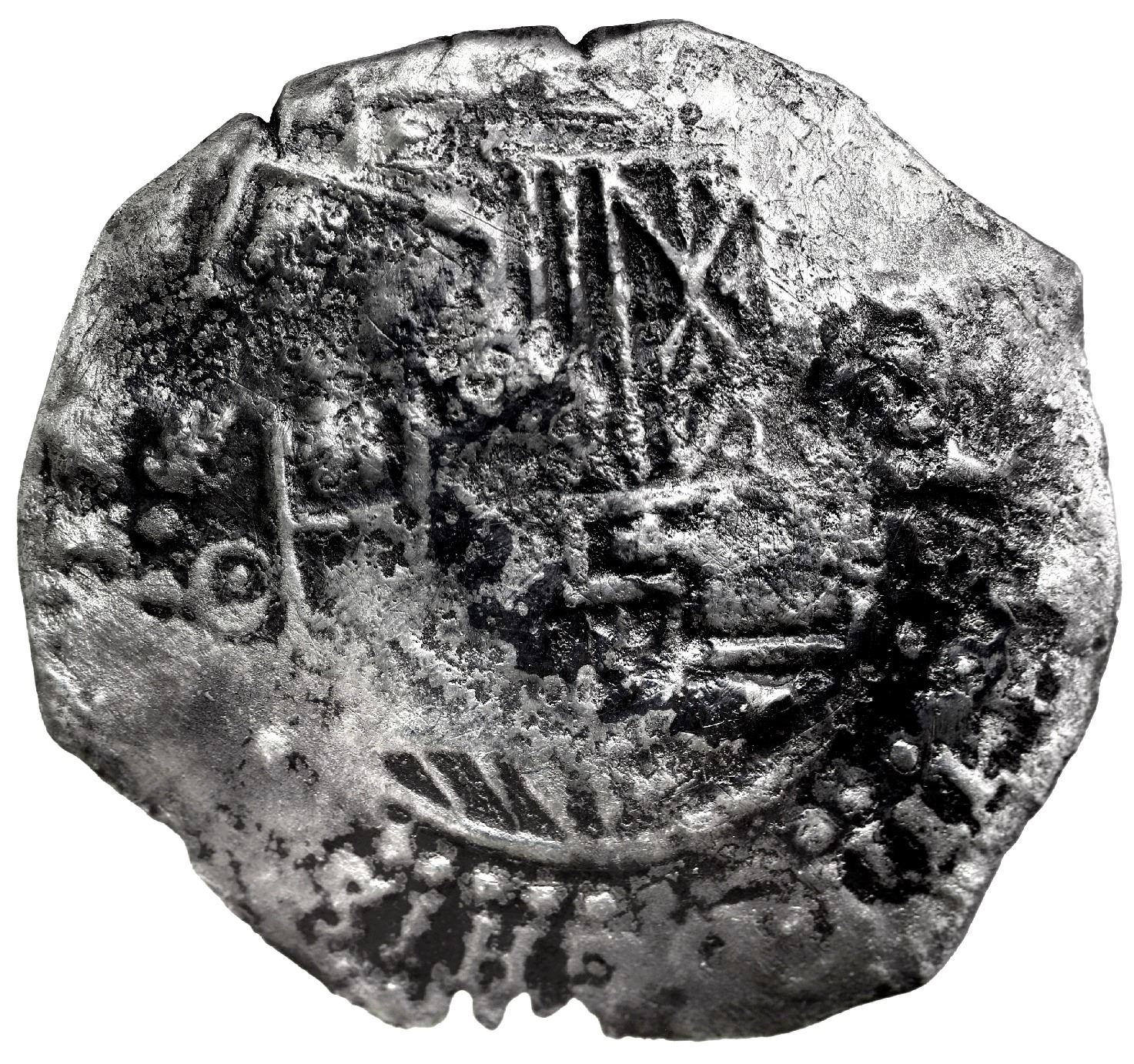 Potosi, Bolivia, cob 8 reales, (1650-1) O, with pentagonal crowned-1652 countermark on cross, very rare, ex-McClung. S-P35; KM-19b. 18.45 grams. Thin from corrosion but with full and clear 1652 date in center of cross from the pentagonal countermark, full assayer to left of shield, patchy toning. Pedigreed to the Rob McClung Collection. Recovered from: Capitana, sunk in 1654 off Chanduy, Ecuador