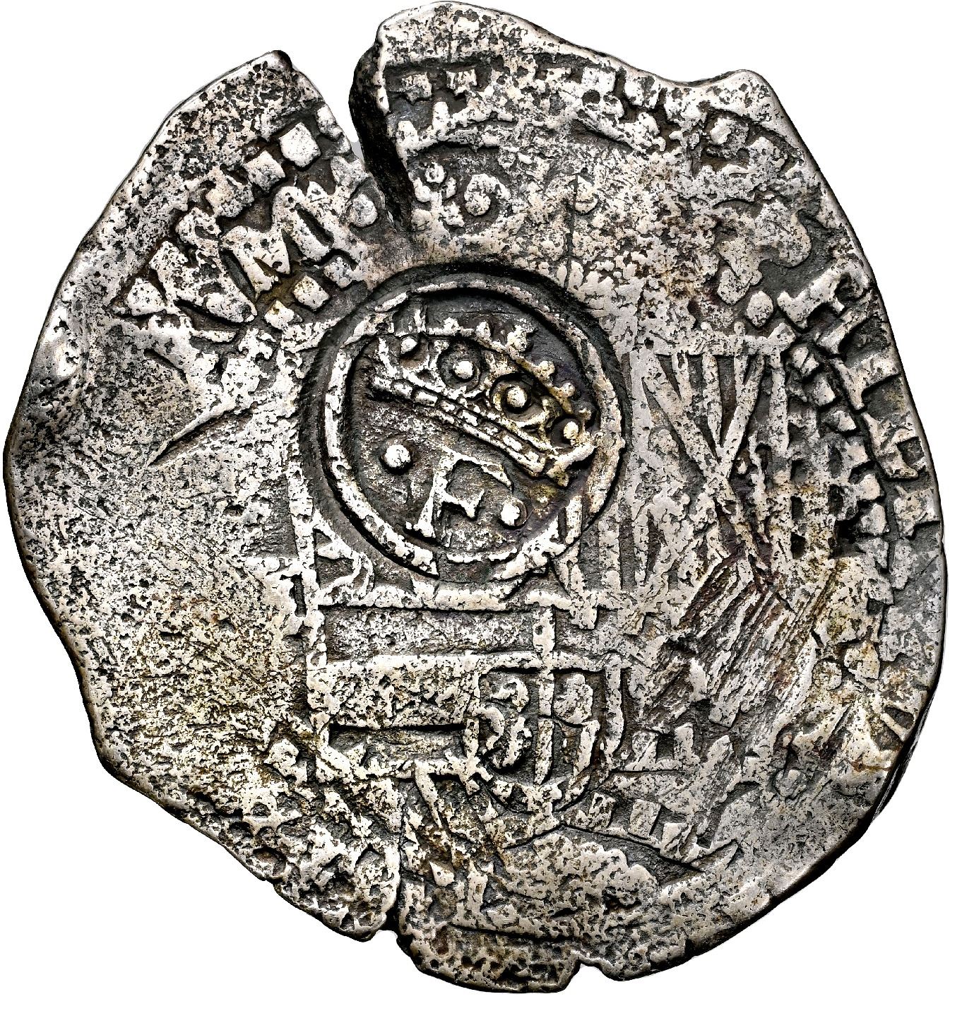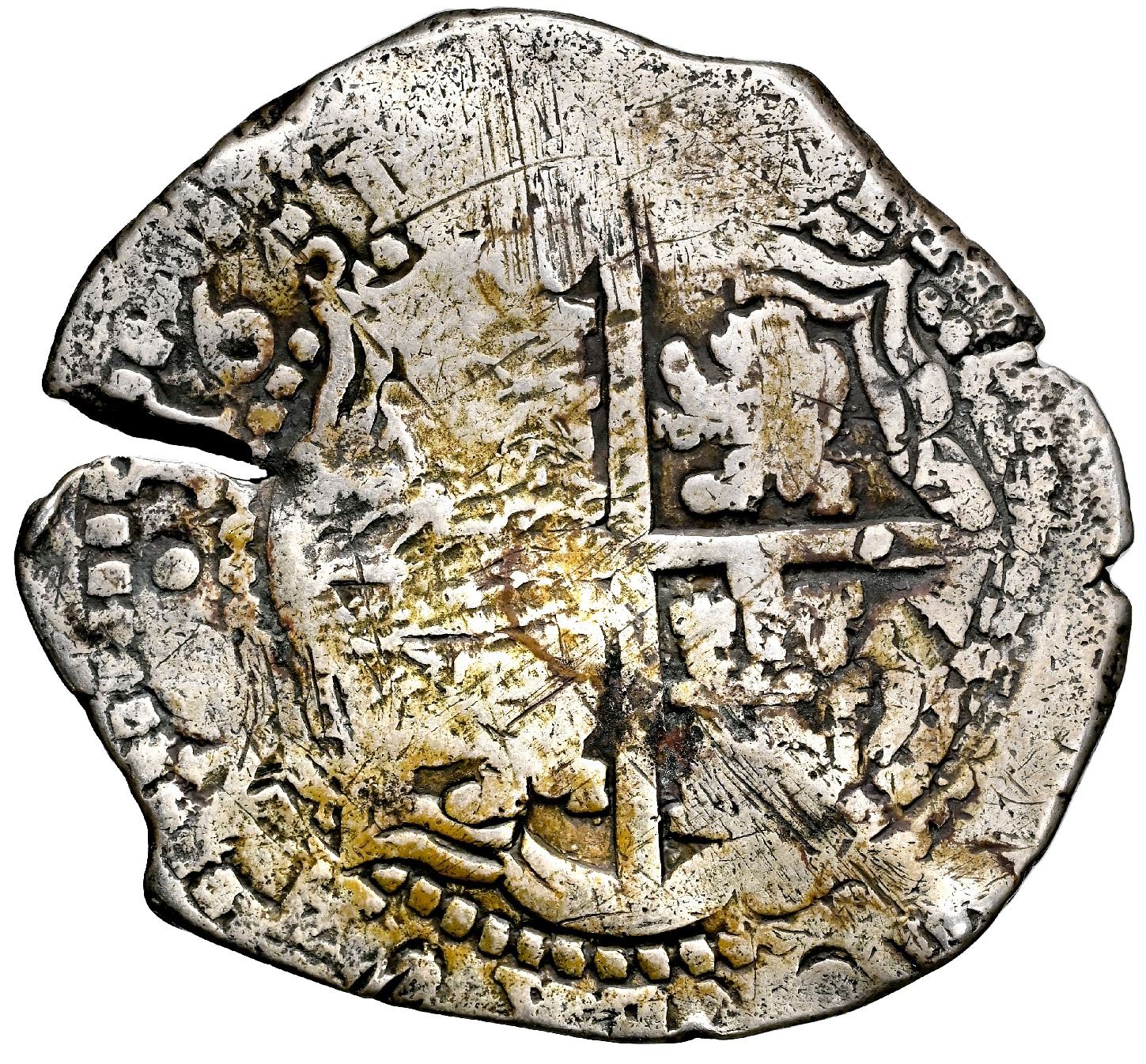 Potosi, Bolivia, cob 8 reales, 1651 E (modern 5), with crowned-dot-F-dot (two dots) countermark on shield, NGC VF details / saltwater damage / Capitana (Shipwreck Blue Label). S-P36; KM-19b; Cal-1491. 26.76 grams. Very bold and 100% full countermark near top of full but weak shield, similar cross with 100% full 1651 date in legend next to edge-crack, some pre-salvage scuffs but no corrosion, toned in crevices. Recovered from: Capitana, sunk in 1654 off Chanduy, Ecuador