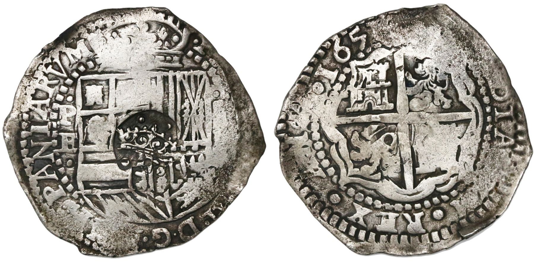 Potosi, Bolivia, cob 8 reales, 1651E, with crowned-dot-F-dot countermark (4 dots) on shield. S-P36; KM-19b; CT-511. 23.64 grams. Bold 165 of date and most of countermark, full cross and crown and shield, nicely contrasting toning, no corrosion except at very edge. Pedigreed to our Auction #5, with original lot-tag #254. Recovered from: Capitana, sunk in 1654 off Chanduy, Ecuador