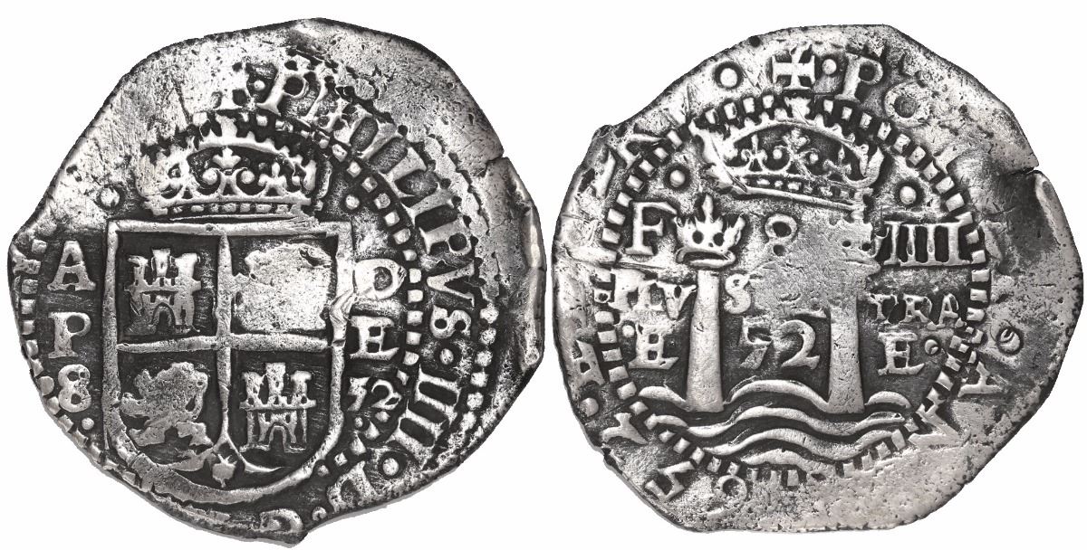 Potosi, Bolivia, cob 8 reales, 1652E Transitional Type V/A. 27.41 grams. Superb specimen, 100% corrosion-free and nicely toned, with full and well-struck inner details (no doubling) and also full PHILIPPVS IIII in legend (shield slightly off-center), very slightly bent. Pedigreed to the Rob McClung collection. Recovered from: Capitana, sunk in 1654 off Chanduy, Ecuador