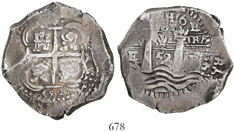Potosi, Bolivia, cob 8 reales, 1652E post-transitional (Transitional Type VIII/B), 1-PH-6 at top.