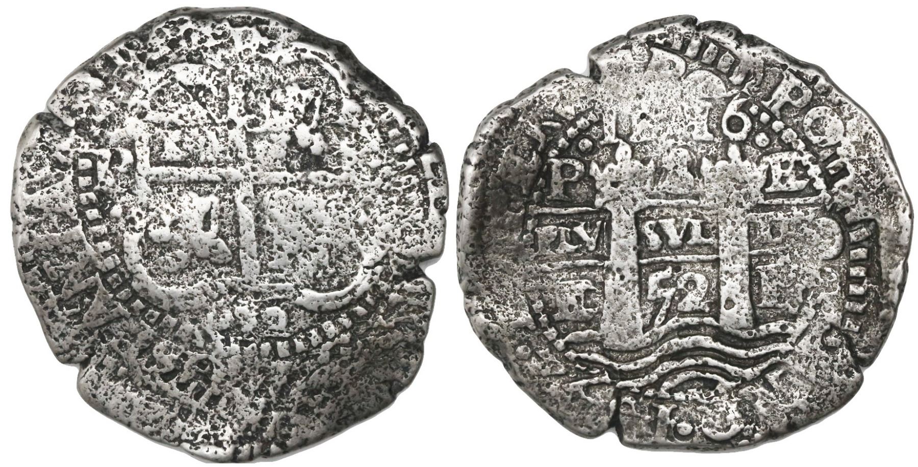 Potosi, Bolivia, cob 8 reales, 1652E post-transitional (Transitional Type VIII/B), 1-PH-6 at top. S-P37a; KM-21; CT-434. 25.32 grams. Full pillars-and-waves with bold 6 of date at top, full but weaker (and slightly off-center) cross, three dates, light surface corrosion. Recovered from: Capitana, sunk in 1654 off Chanduy, Ecuador