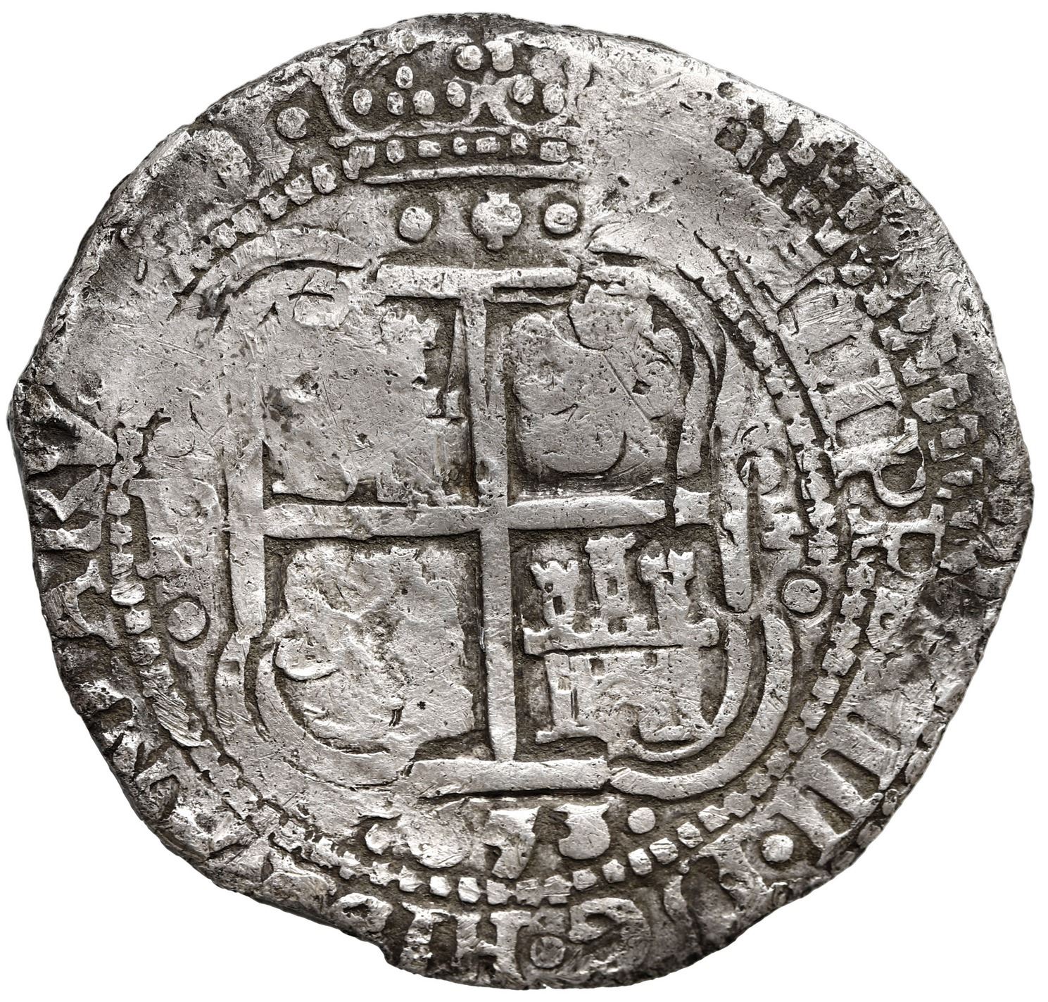 Potosi, Bolivia, cob 8 reales, 1653 E, PH at top (no dots), date in three digits below cross. S-P37a; KM-unl; Cal-unl. 26.95 grams. Broad flan with choice full cross-lions-castles (somewhat Royal-like) including crown and king's name and ordinal, the other side cruder but with clear (fat) pillars, three dates and mintmarks and assayers, VF with light toning in crevices, old scrape on pillars side.