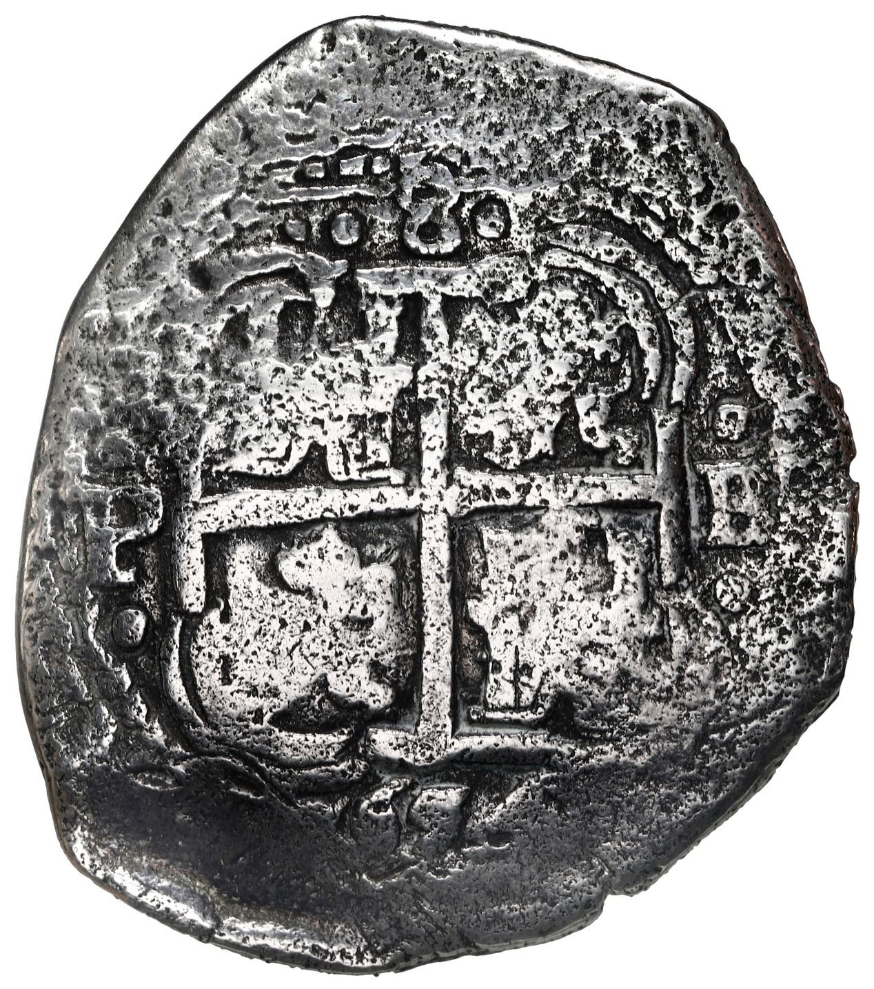 Potosi, Bolivia, cob 8 reales, 1654 E, dot-PH-dot at top, denomination 8 above cross. S-P37a; KM-21; Cal-1507. 23.67 grams. Silvery and smooth and somewhat oblong from corrosion, with bold PH and good full waves, two dates, three mintmarks and assayers. From: Capitana, sunk in 1654 off Chanduy, Ecuador