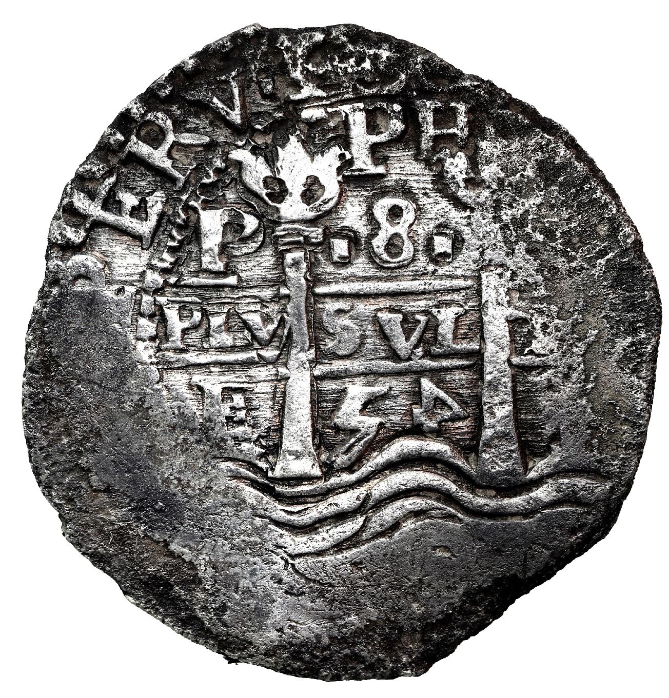 Potosi, Bolivia, cob 8 reales, 1654 E, retrograde 4 in date (rare), PH at top, Mastalir Plate. S-P37a; KM-21. 23.85 grams. Choice pillars side with bold PH at top and 54 date with 4 in retrograde (only three known of this variety, according to Mastalir), the cross corroded, doubled, and slightly off-center (top not visible to determine variety) but with bold 654 date below, deeply toned all over. Plate Coin I.3.ad.-x on page 151 of Robert Mastalir's The Great Transition at the Potosi Mint 1649-1653 / The Post-Transitional Coinage of 1653-1659 (2023), with original (generic) Herman Moro certificate. Recovered from: Capitana, sunk in 1654 off Chanduy, Ecuador