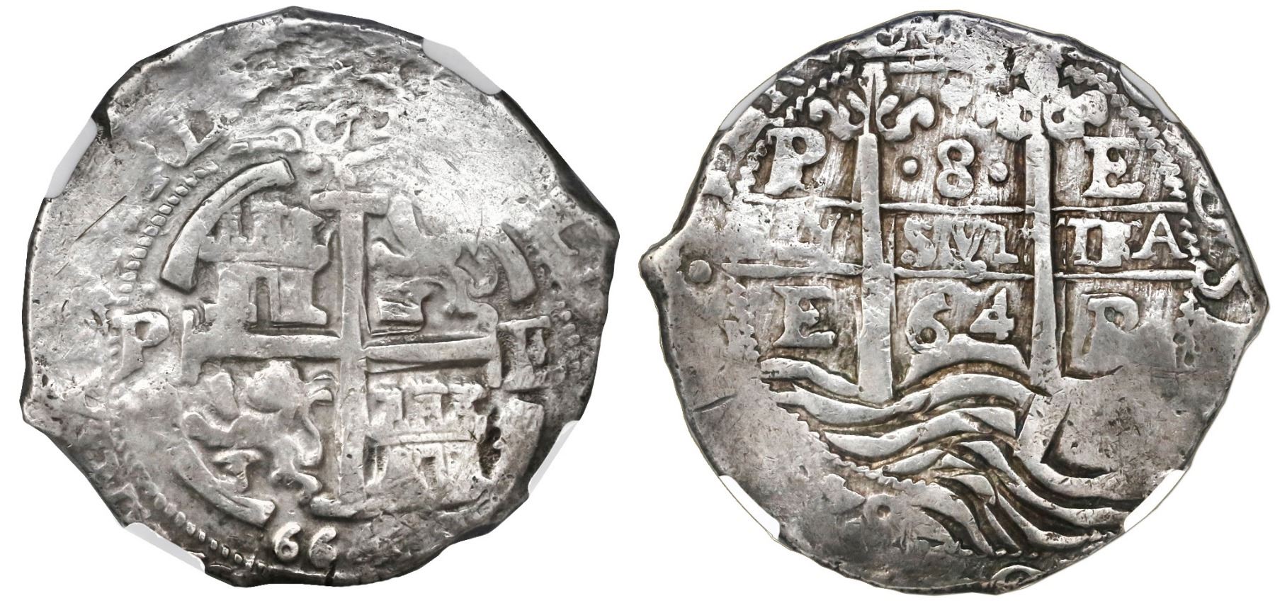 Potosi, Bolivia, cob 8 reales, 1664E, NGC VF 25. S-P37a; KM-21; CT-453. 27.4 grams Choice full cross and pillars (the waves [only] a bit doubled), all three dates and mintmarks and assayers visible, traces of toning around details only. NGC #4459362-009.