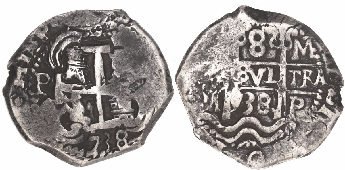 Potosi, Bolivia, cob 8 reales, 1738M. 26.43 grams. Bold full pillars-and-waves, full but cruder cross, two bold dates and mintmarks, deeply toned VF on a typically chunky flan.
