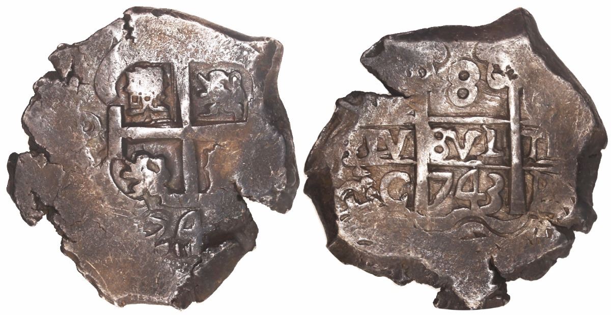 Potosi, Bolivia, cob 8 reales, 1743C, ex-Trastamara. 26.99 grams. Very chunky flan with crude edge (as made), good pillars and cross with two bold dates, high grade (XF), darkly toned. Pedigreed to the Isabel de Trastamara collection (Aureo & Calico auction of May 2014, with original lot-tag #620).