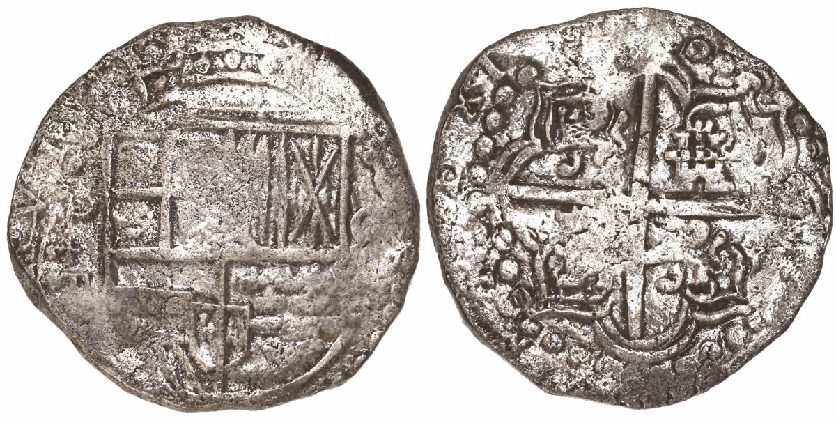 Potosi, Bolivia, cob 8 reales, Philip III, assayer T, quadrants of cross transposed, Grade-1 quality but Grade 2 on the certificate (unofficial replacement), with original tag. 26.82 grams. Full weight and almost perfectly round, with no corrosion, the full shield and cross just slightly weakly struck, full P+T. With Fisher tag #164244 and Historic Research and Certification replacement photo-certificate. Recovered from: Atocha, sunk in 1622 west of Key West, Florida