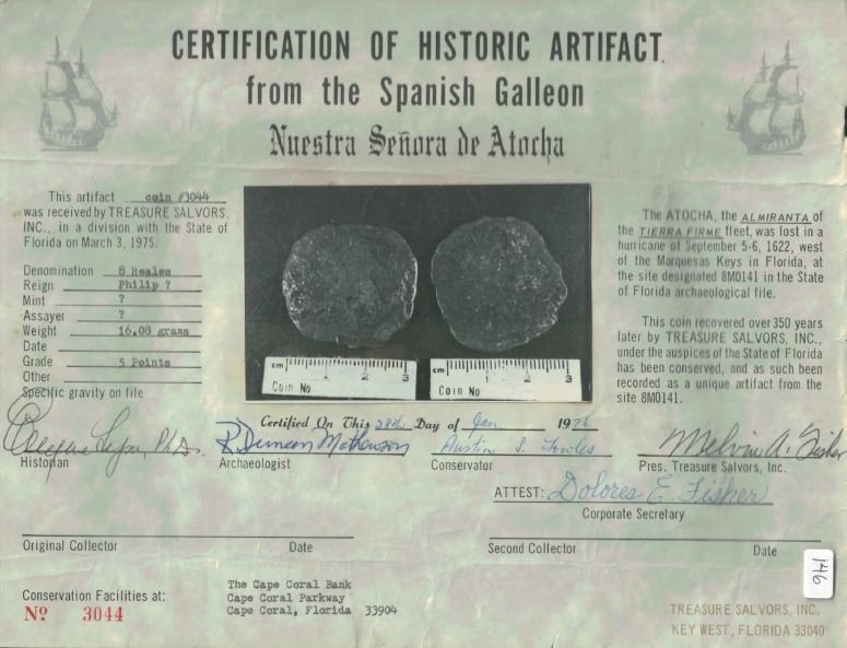 Potosi, Bolivia, cob 8 reales, Philip III, assayer not visible, 5 points (Grade 4), hand-signed certificate from 1976. KM-10. 15.88 grams. Clear cross despite heavy corrosion and dark encrustation (not fully cleaned), desirable as pre-"Mother Lode" find. With original hand-signed (as Melvin A. Fisher) Fisher certificate #3044 from 1976 (Cape Coral Bank). Recovered from: Atocha, sunk in 1622 west of Key West, Florida