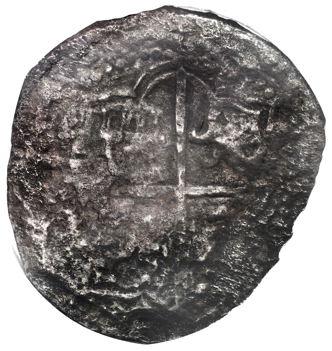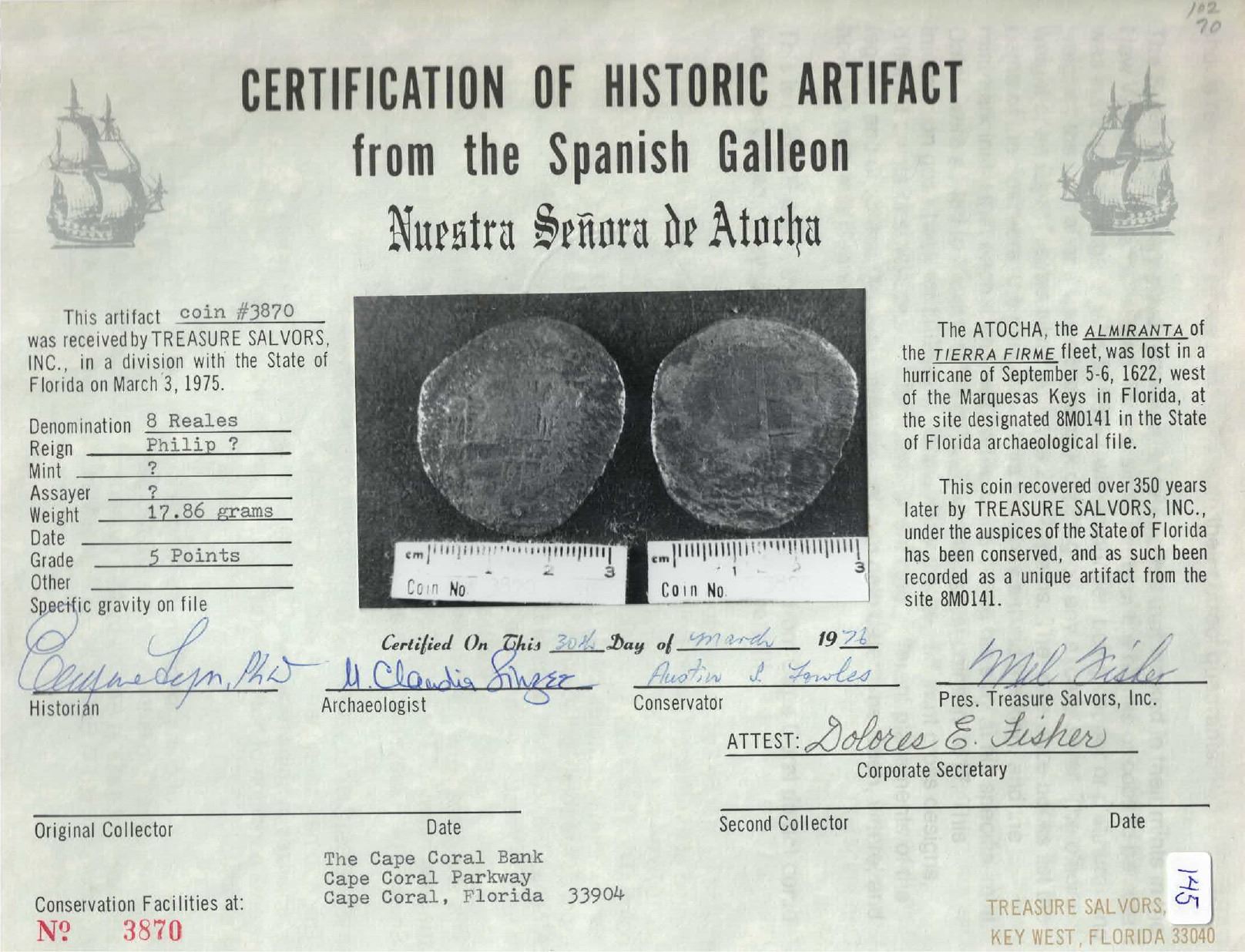 Potosi, Bolivia, cob 8 reales, Philip III, assayer not visible, "5 points," with hand-signed Fisher certificate from 1976. KM-10. 17.95 grams. Corroded and toned all over but with clear cross and shield. With original tag and photo-certificate 3870 from 1976 (Cape Coral Bank) hand-signed by Mel Fisher, Dolores Fisher, Eugene Lyon, M. Claudia Singer and Austin Fowles. From: Atocha, sunk in 1622 west of Key West, Florida
