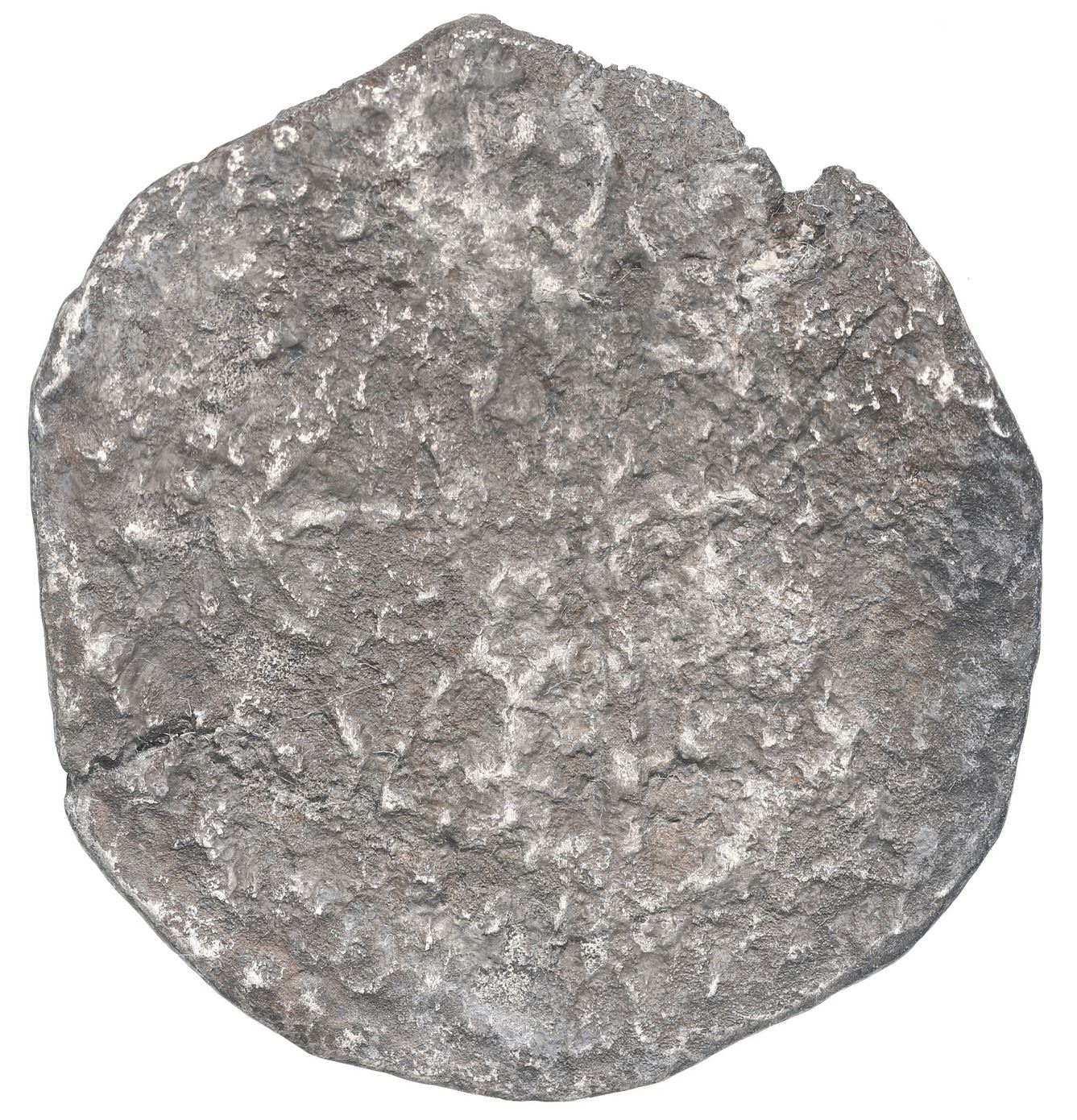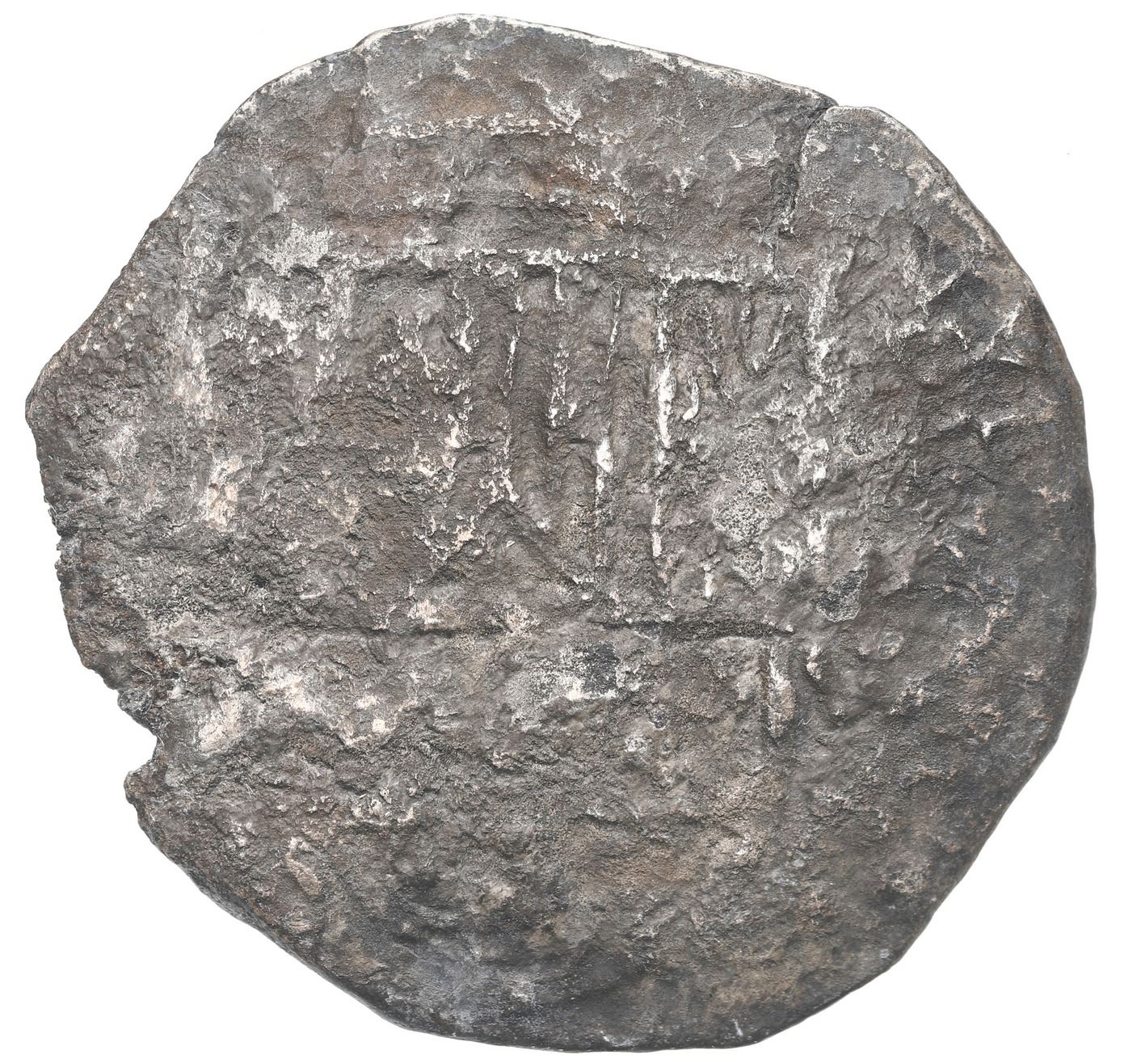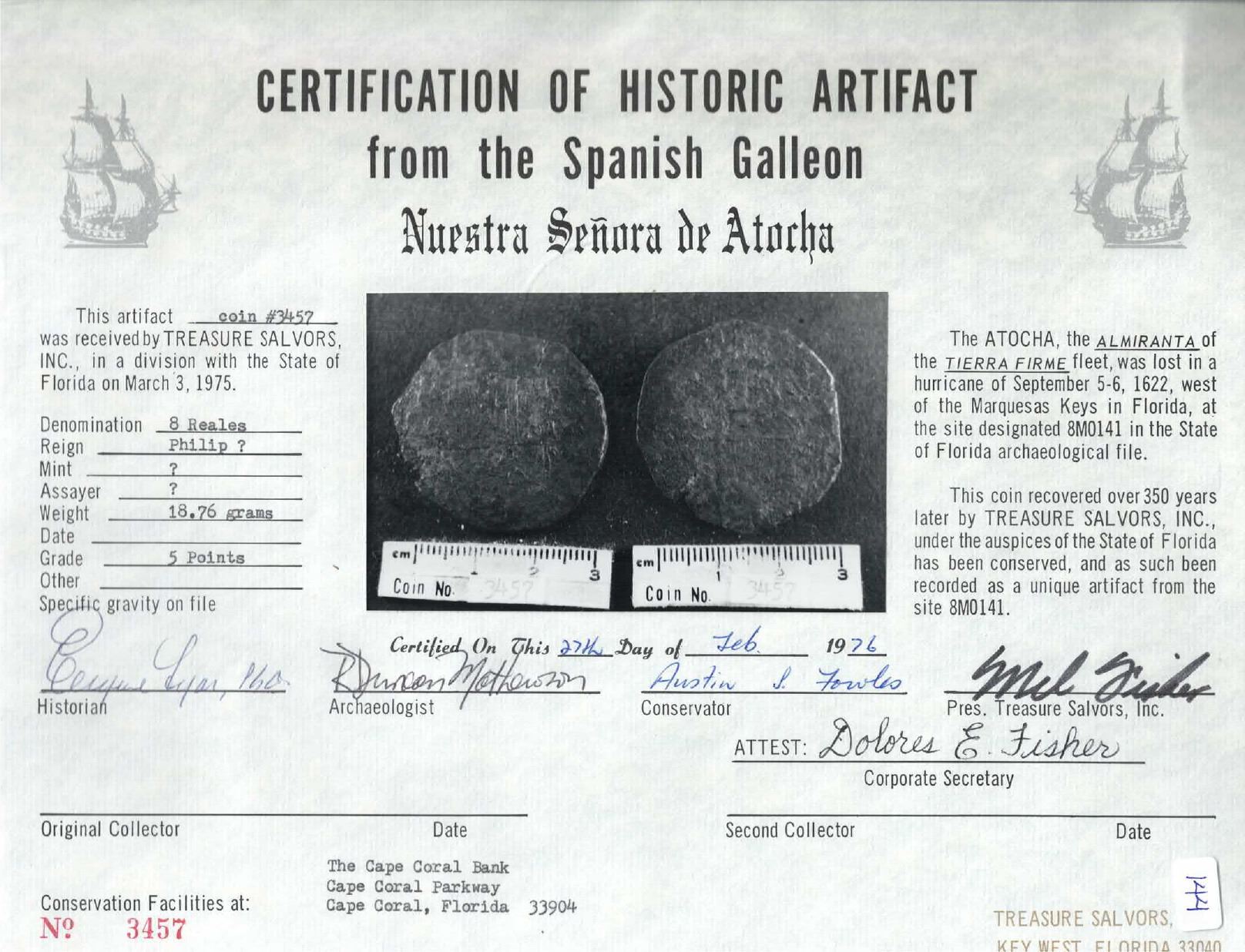 Potosi, Bolivia, cob 8 reales, Philip III, assayer not visible, "5 points," with hand-signed certificate from 1976. KM-10. 18.82 grams. Darkly encrusted and corroded but with nearly full shield and cross still in evidence. With original tag and photo-certificate 3457 from 1976 (Cape Coral Bank) hand-signed by Mel Fisher, Dolores Fisher, Eugene Lyon, R. Duncan Mathewson and Austin Fowles. From: Atocha, sunk in 1622 west of Key West, Florida
